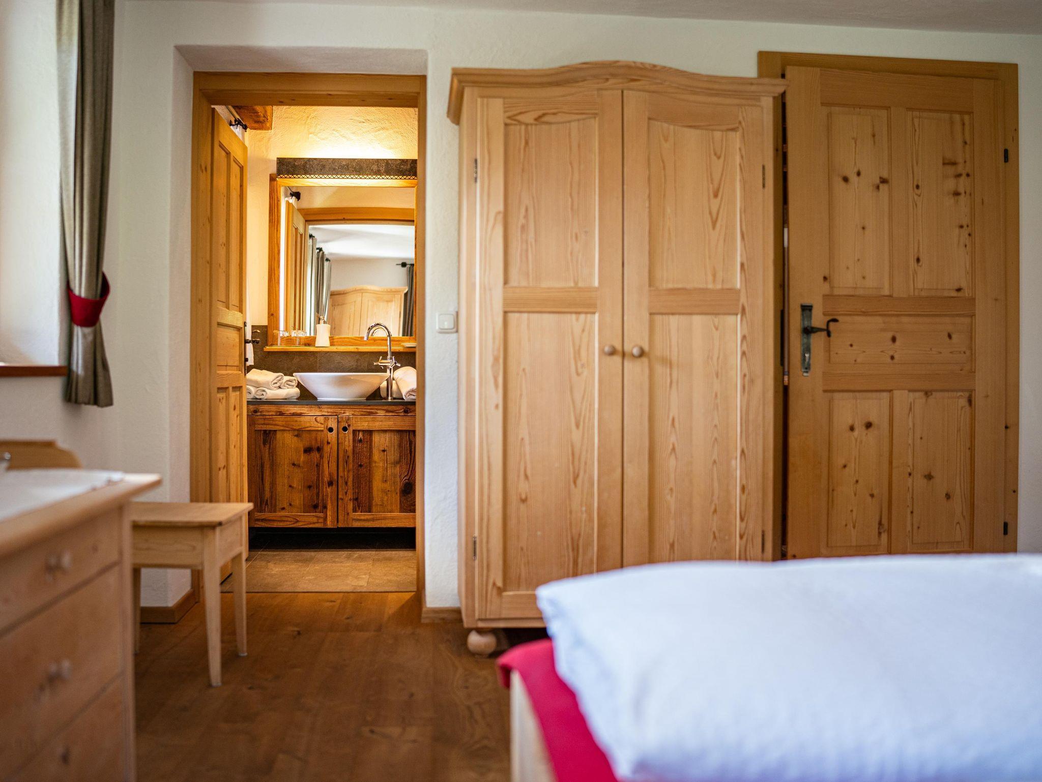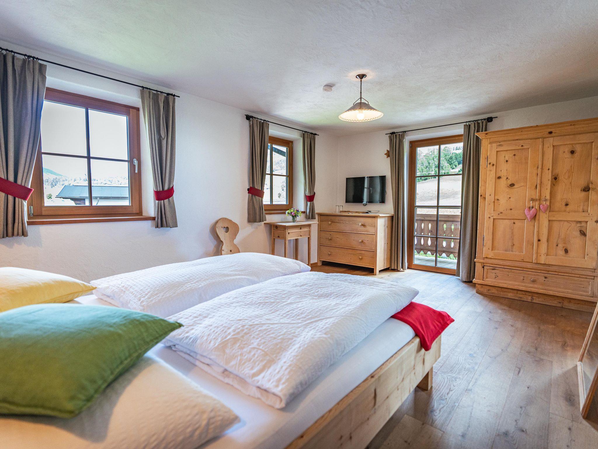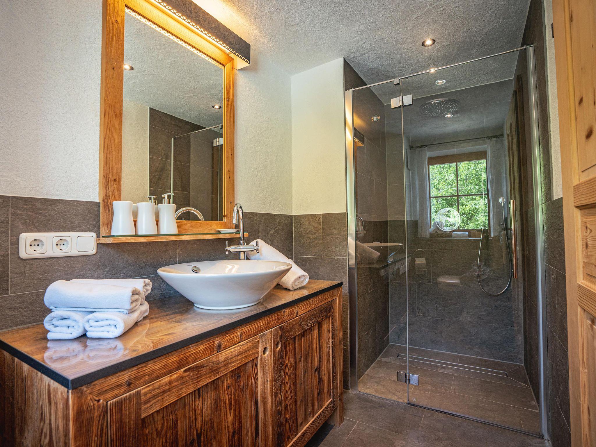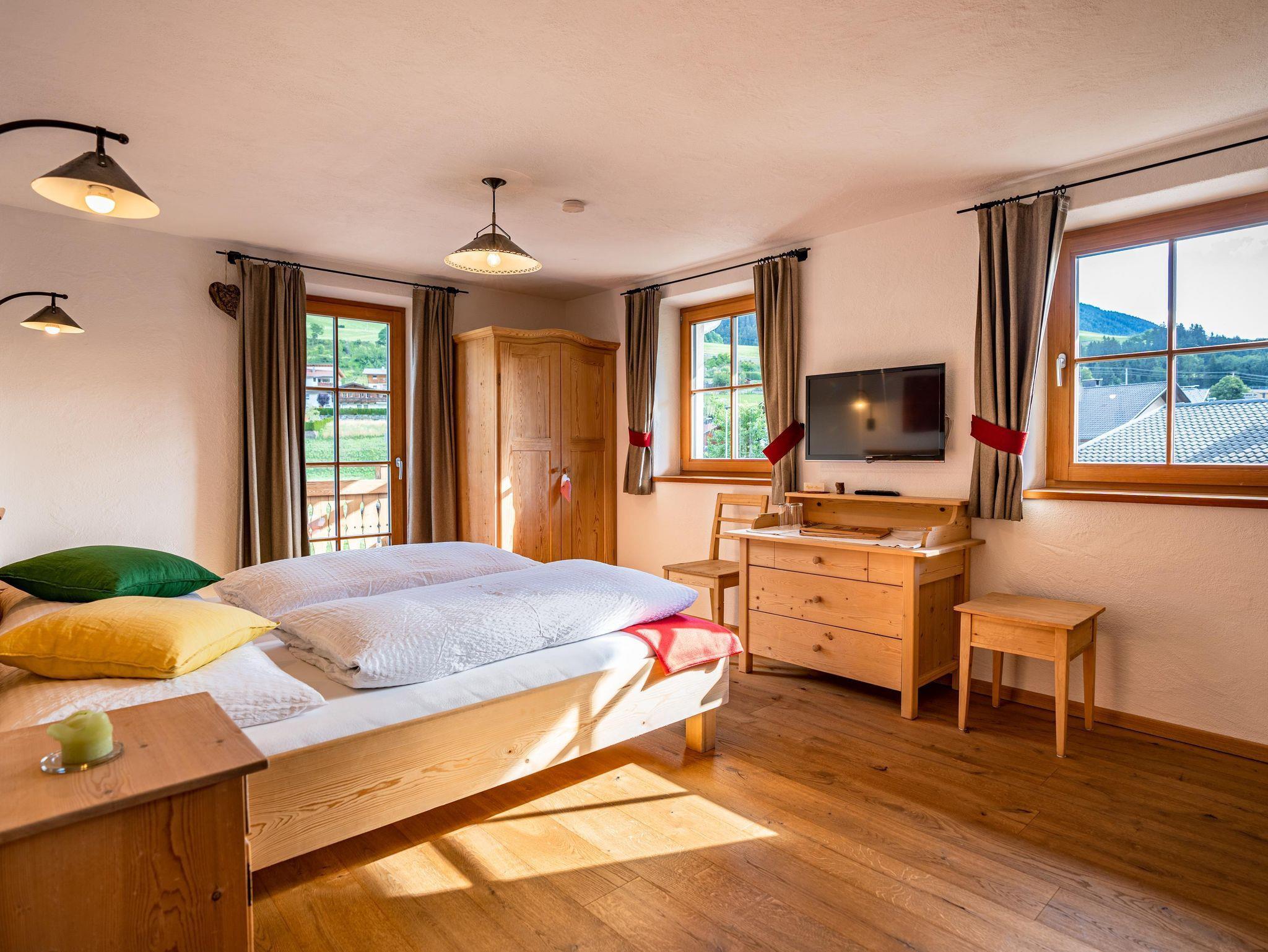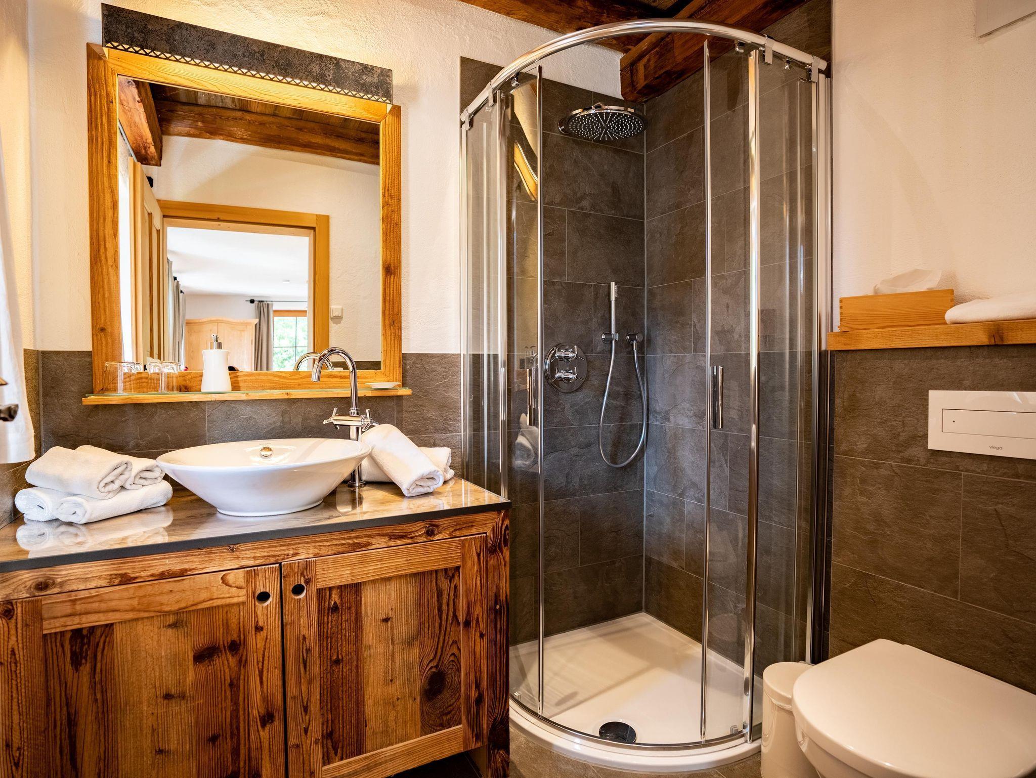 Doppelzimmer im Alpin-Chalet-Stil ist hochwertig mit natürlichen Materialien (Altholz, Lärchenholz, Naturstein, Loden), Doppelbett, Massivmöbel, Badezimmer (Dusche, WC, Handtuchtrockner), Flat TV (über 100 Programme), Wlan, Balkon ausgestattet.