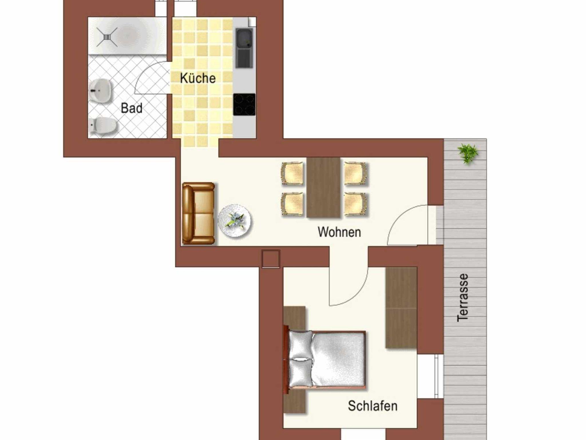 Wohnzimmer, Bad/WC, Küche, Schlafzimmer inkl. Zustellbett, überdachte Terrasse, großzügiger Garten umgeben von Obstbäumen, 44m²