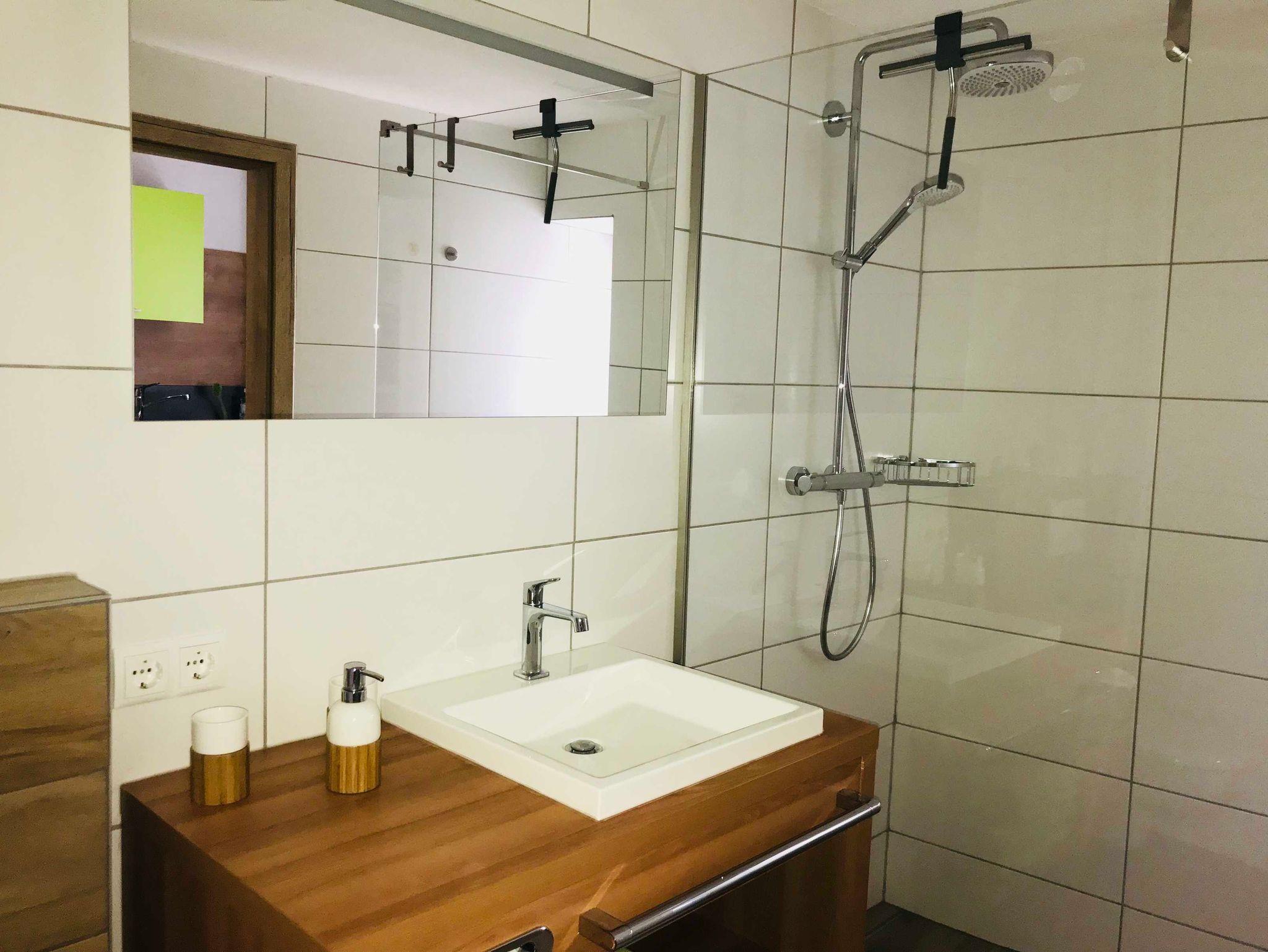 Walk-in Dusche, Haarföhn, Geschirrspüler, Ceranfeld, Backrohr, Nespresso Maschine, Wasserkocher, Toaster, Kühlschrank mit Gefrierfach, moderne Gartenmöbel