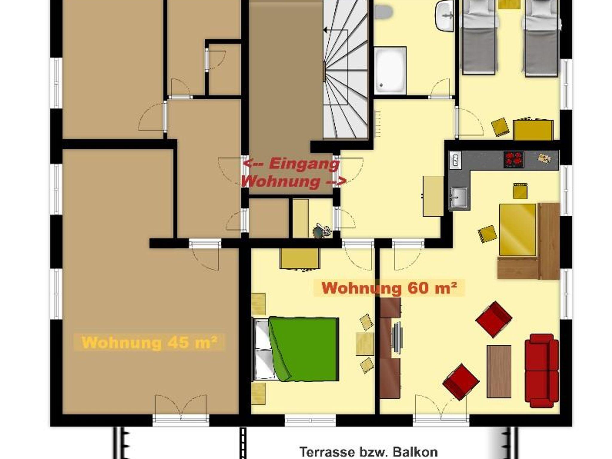 Die Ferienwohnungen sind jeweils 60 m² groß und bestehen aus einem großen Wohnraum mit LCD-TV, Sofa, komplett eingerichteter Wohnküche mit gemütlicher Eckbank, zwei Schlafzimmern, Bad mit Dusche sowie einem Vorraum mit Abstellraum - traumhafte Bergblicke vom Balkon.