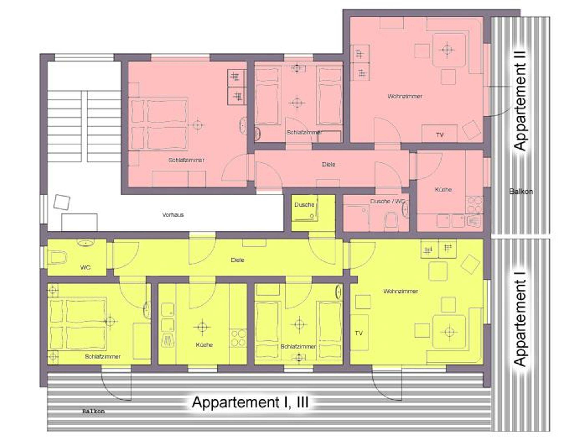 Das Appartement III im 2. Stock bietet auf 60 m² Platz für 2-4 Personen. Die Wohnung verfügt über einen möblierten Balkon, eine voll ausgestattete Küche, ein Wohn- und Esszimmer, zwei getrennte Schlafzimmer (Doppelbett bzw. zwei Einzelbetten) sowie Dusche und WC getrennt. Gratis WLAN sowie Kabel-TV und Radio stehen zur Verfügung. Brötchenservice wird angeboten.