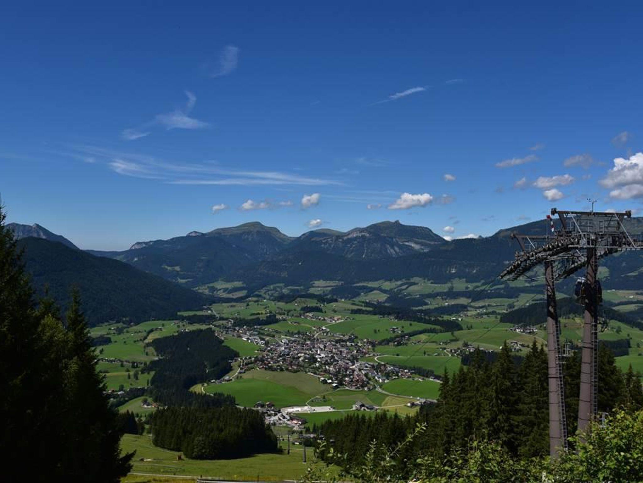 Ferienwohnung mit Balkon, 2 getrennte Schlafzimmer, Wohnküche komplett eingerichtet mit Radio, TV, Mikrowellenherd, Küchenblock; Dusche und WC getrennte Räume. Blick auf die Abtenauer Bergwelt. Bettwäsche, Handtücher, Badetücker inkl.