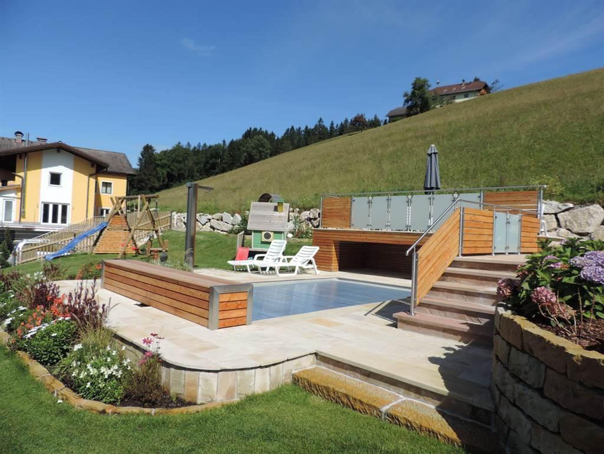 Unsere modern ausgestattete Ferienwohnung im 2. Stock (55qm) bietet sich besonders für Familien mit Kindern, aber auch für Pärchen an. Sie verfügt über 2 getrennte Schlafzimmer - ein sehr geräumiges Doppelzimmer (23qm) mit großem LED-TV und ein Zimmer mit einem Stockbett (Verbindungstür/Durchgang zum Schlafzimmer), ein Wohnzimmer mit gemütlicher Eckbank, LED-TV, Stereoanlage, DVD, W-LAN kostenlos, einer Dusche mit WB, einem separaten WC, und einer voll ausgestatteten Küchen mit Besteck, Tischwäsche und sonst. Utensilien. Der Ausblick vom Balkon auf die Berge ist atemberaubend. Unser Garten mit Gartenhütte und Kinderspielplatz (Grillmöglichkeit vorhanden/Poolbenützung kostenlos/saisonal) steht ihnen jederzeit gerne zur Verfügung.