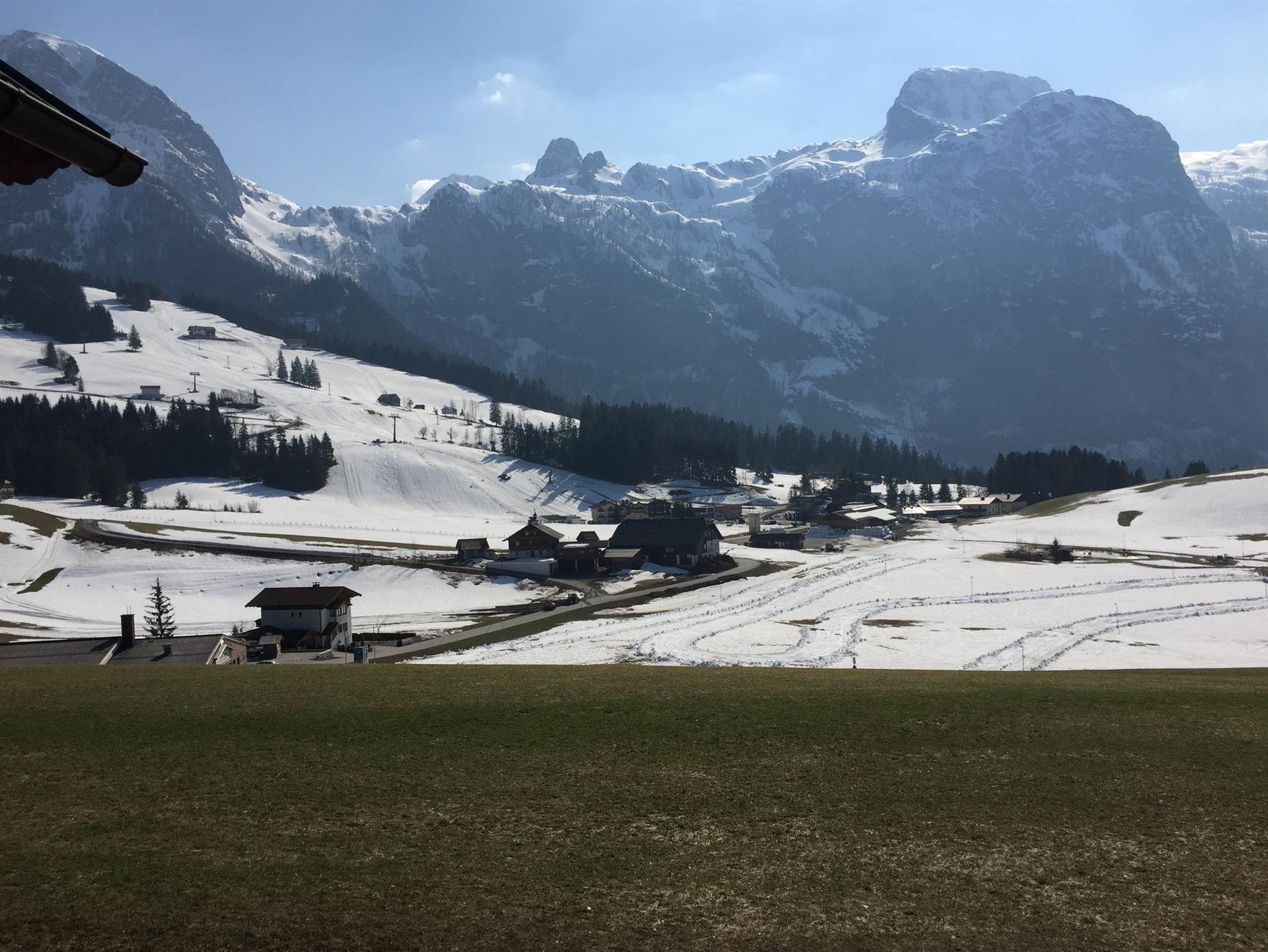 Das Doppelzimmer verfügt über ein Badezimmer mit Dusche und Badwanne bzw. über ein WC extra. Der Blick vom Balkon richtet sich in Richtung Karkogel.