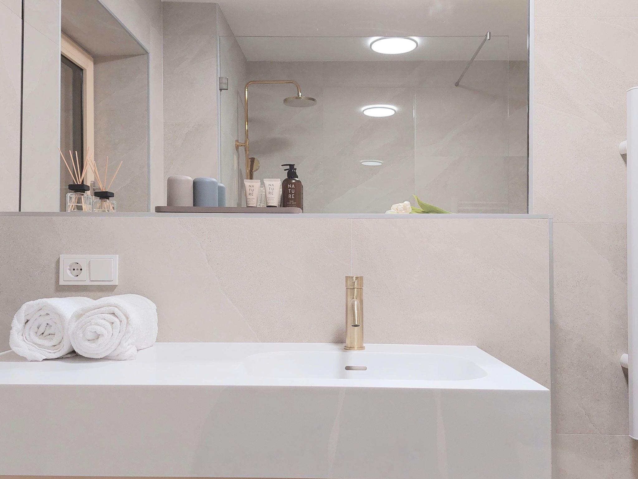 1 Badezimmer mit eleganter Sanitärausstattung, Waschbecken und geräumige Walk-In-Dusche, räumlich getrenntem WC mit Hygienedusche und Handwaschbecken.