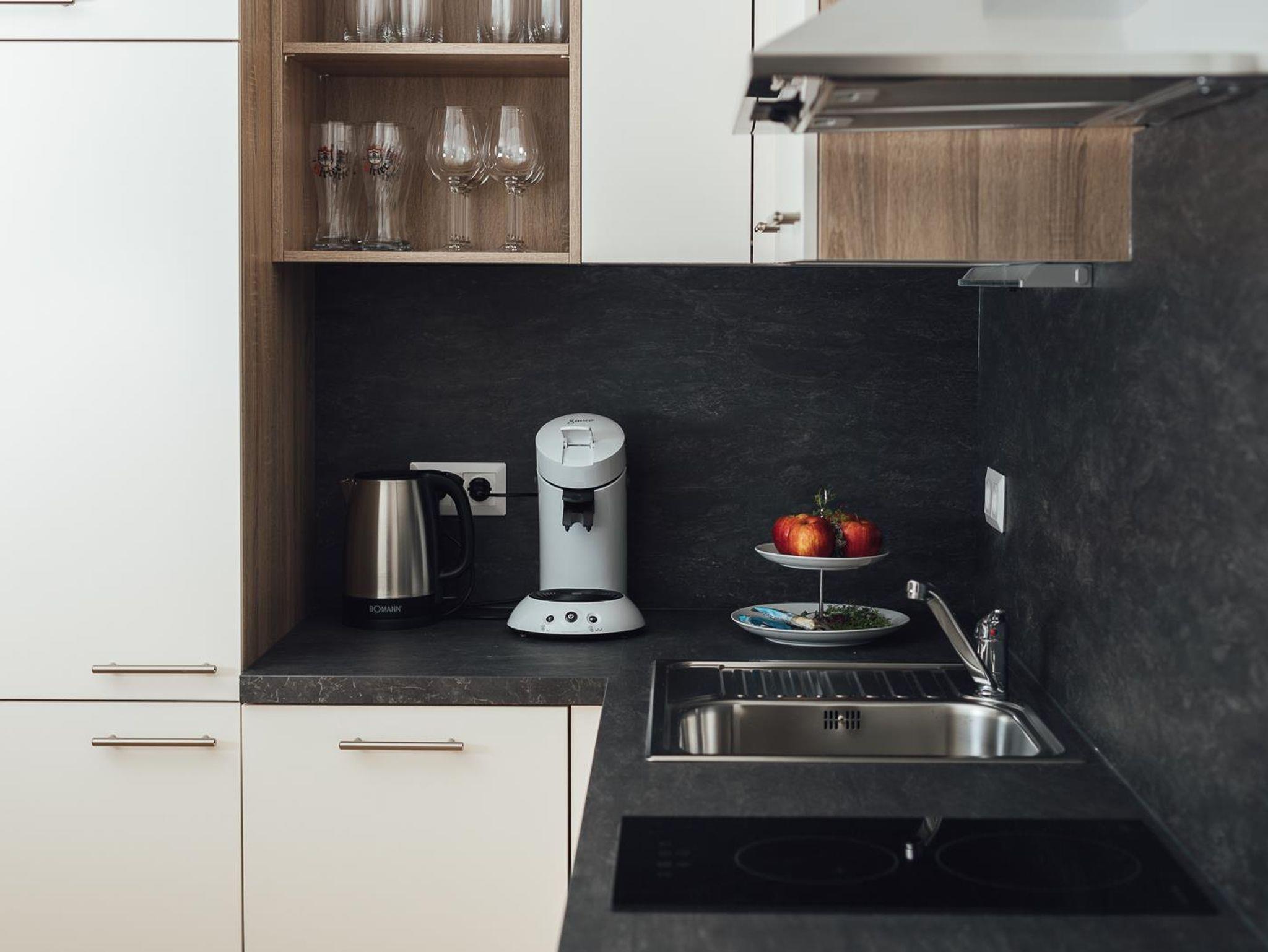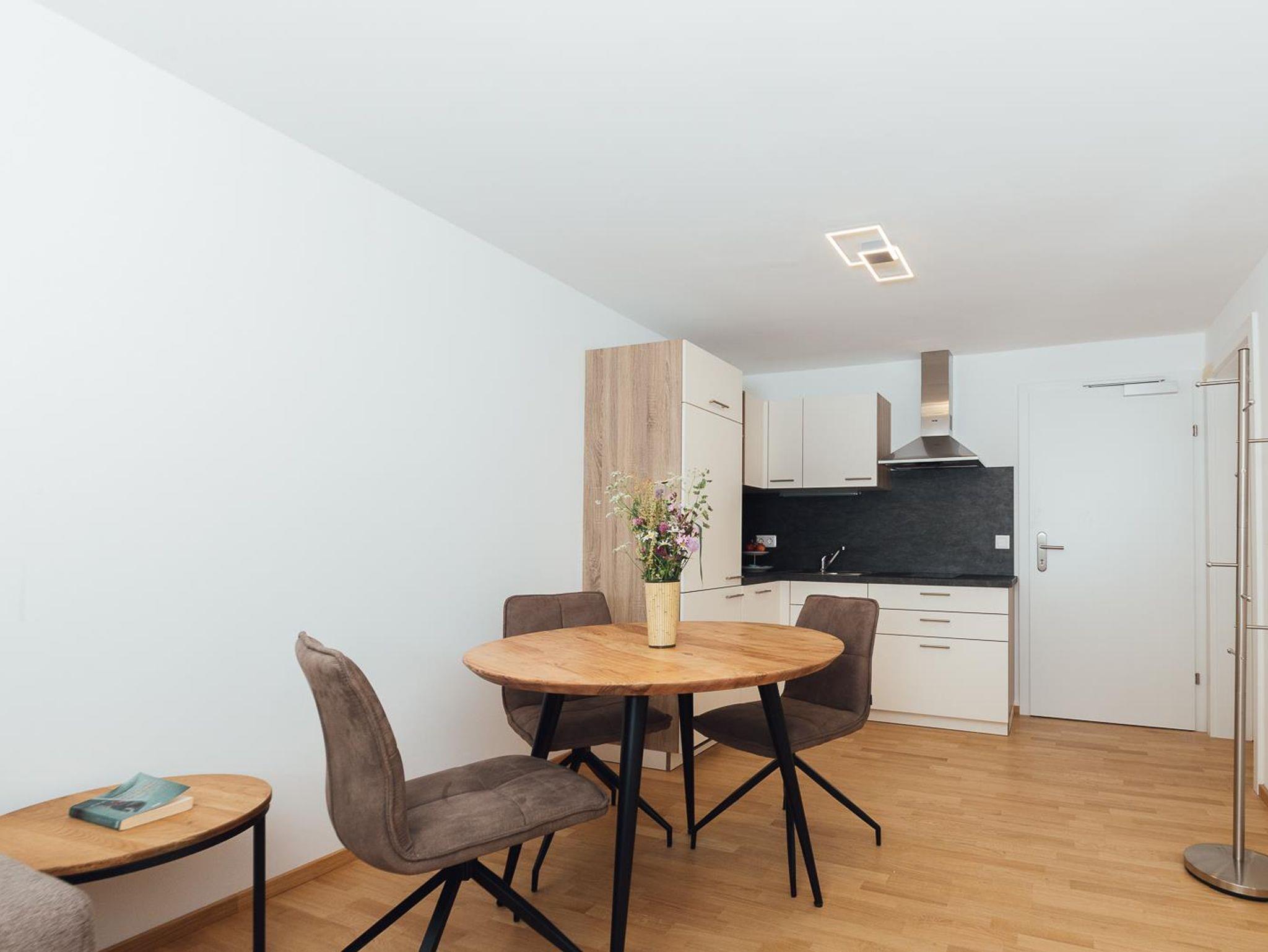 Modern eingerichtetes Appartement für 2 bis 4 Personen, Wohnzimmer mit Schlafcouch, Schlafzimmer, Badezimmer und Küchenzeile