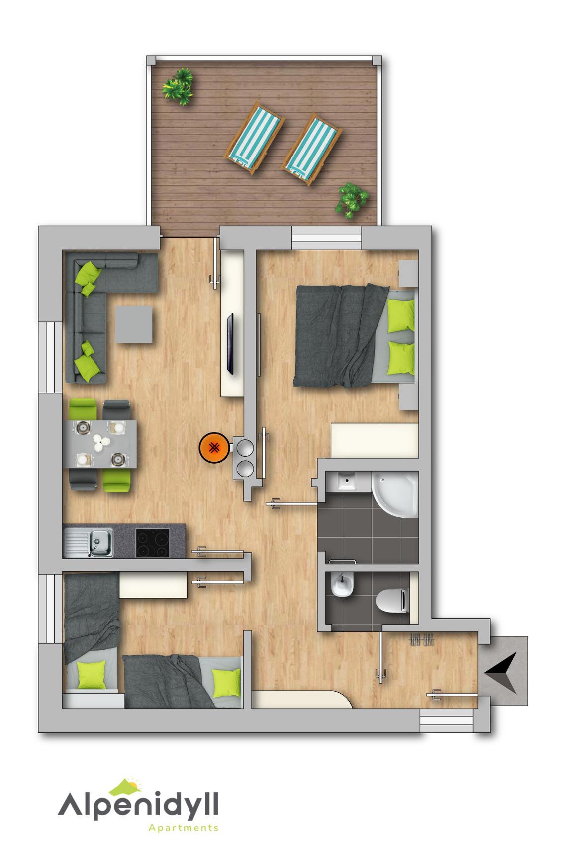 Herzlich willkommen in unserer Ferienwohnung Happy Aich 3. Auf zirka 46 m² ist für maximal sechs Personen alles für einen wunderschönen Urlaub vorbereitet.