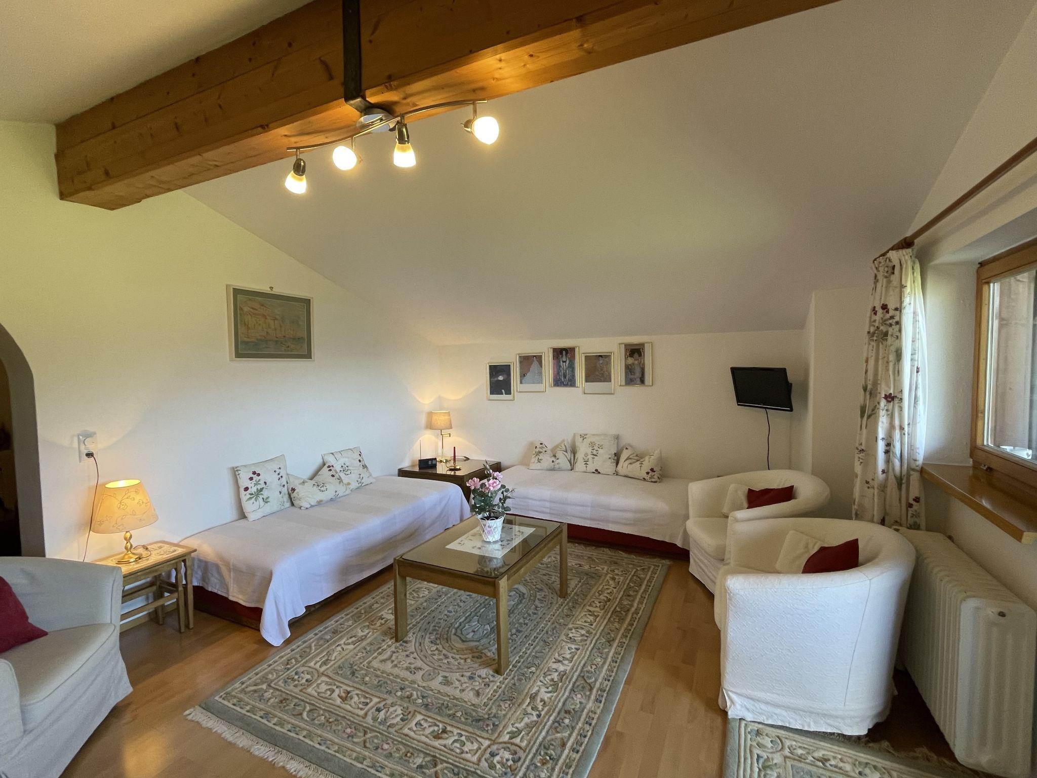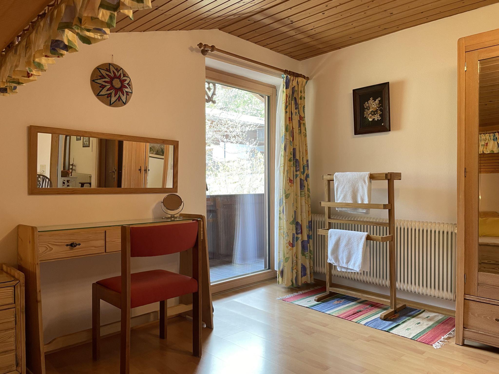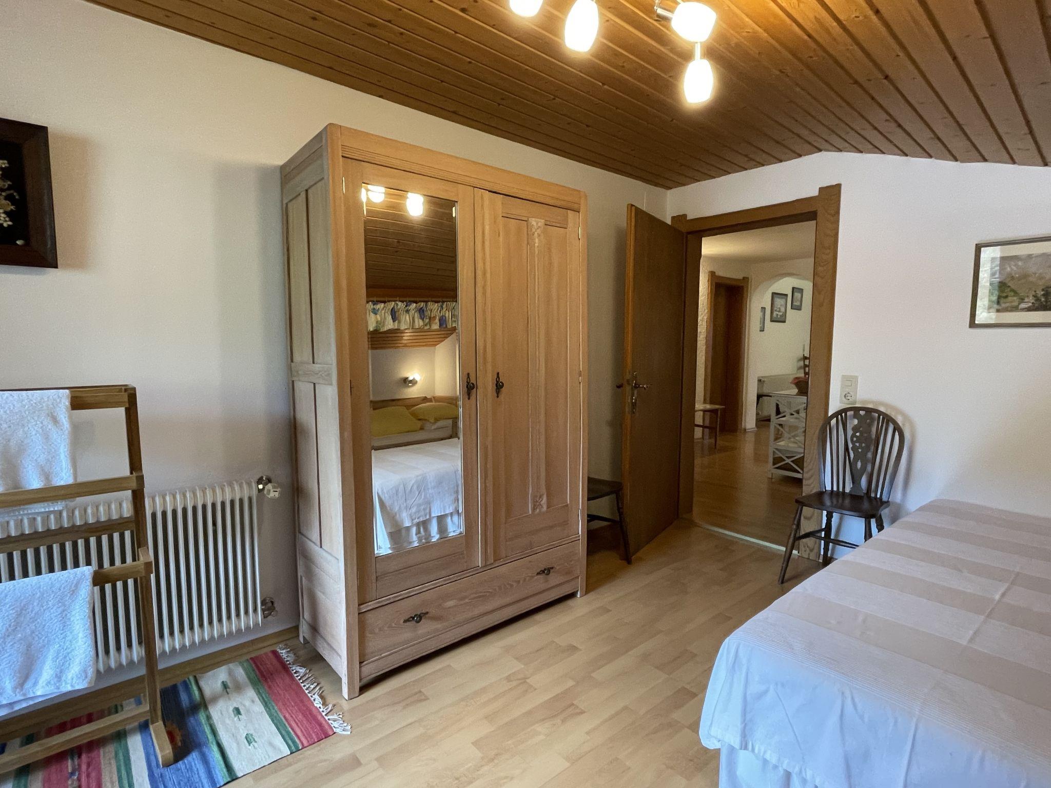 3-room apartment 87 m2, on the top floor. Spacious and bright, partly with sloping ceilings, beautiful furnishings: open living room with satellite TV and radio. Exit to the balcony. 1 double bedroom with hand-basin. 1 room with 3 beds. Exit to the balcony. Open dining room with dining nook. Kitchen (4 hot plates, oven, dishwasher, toaster, kettle, microwave, electric coffee machine) with hatch. Bath/WC, sep. WC. Balcony, south-west facing position. Balcony furniture. Very beautiful panoramic view of the mountains and the valley. Facilities: children's high chair. Internet (WiFi, free). Please note: smoke alarm.