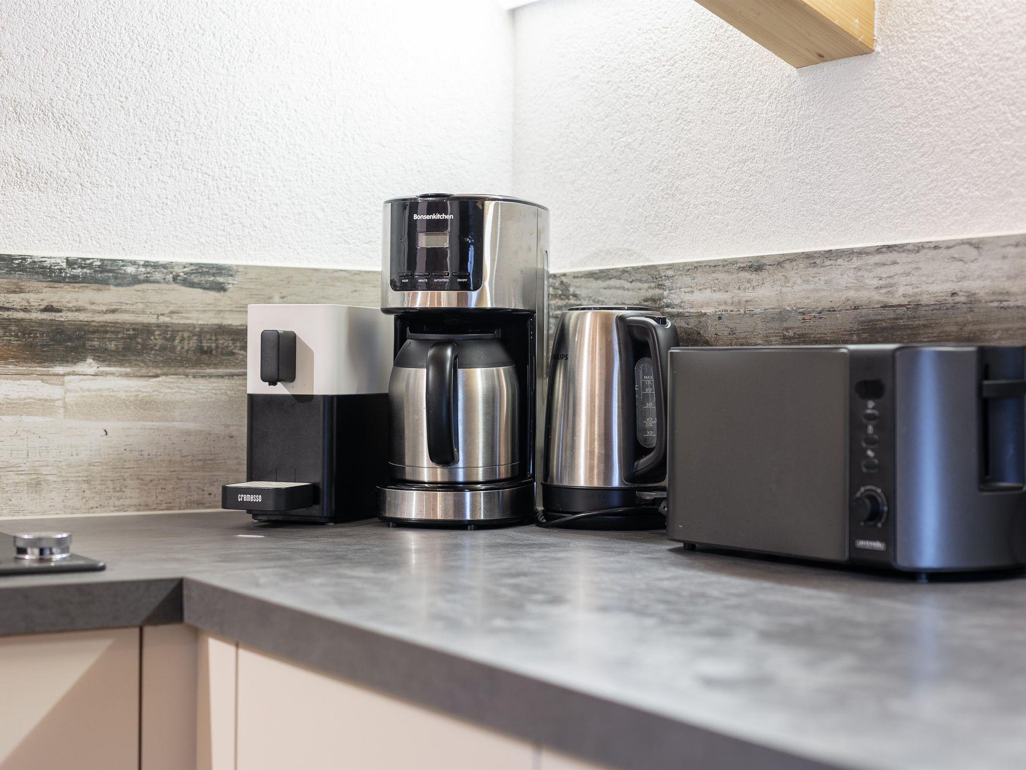 In der Küche finden Sie alles, was Sie brauchen – inklusive Filterkaffeemaschine und Cremesso-Kapselmaschine für den perfekten Start in den Tag.