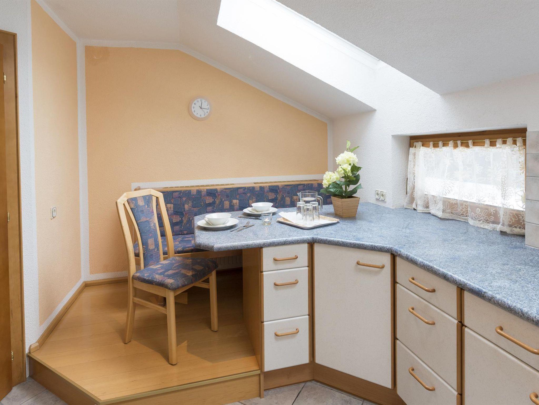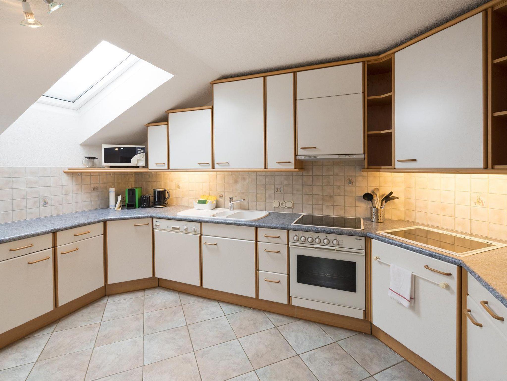 Die große Küche ist komplett ausgestattet und hat eine komfortable Sitzecke.