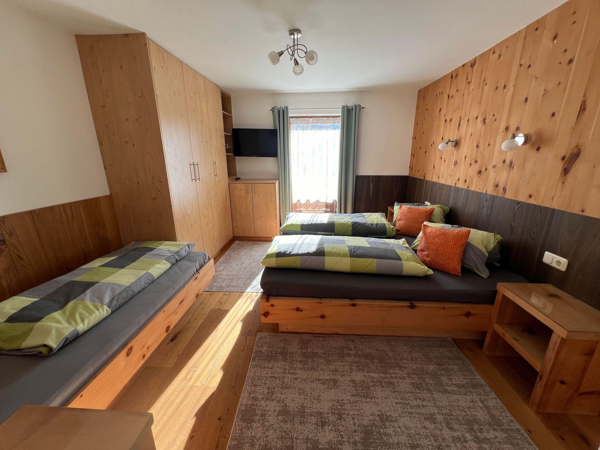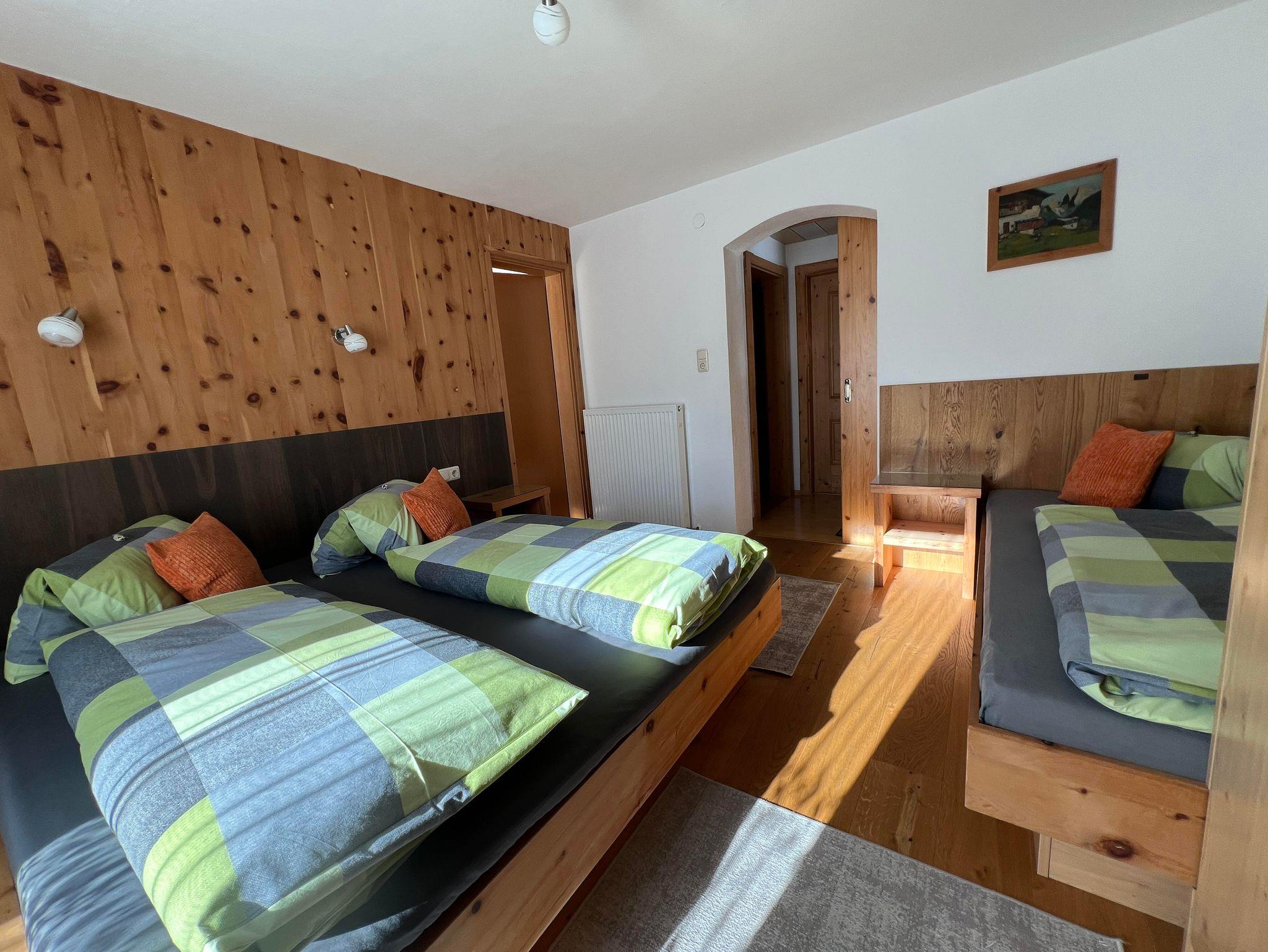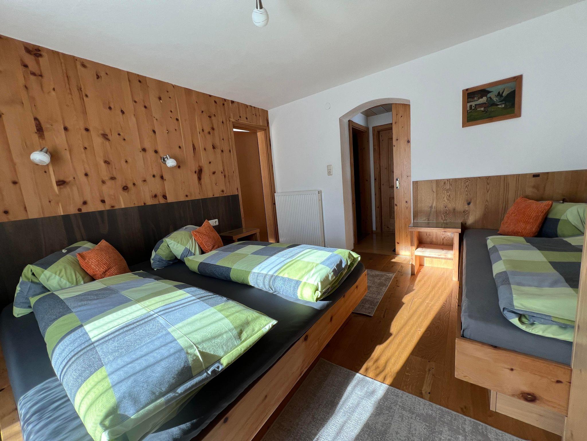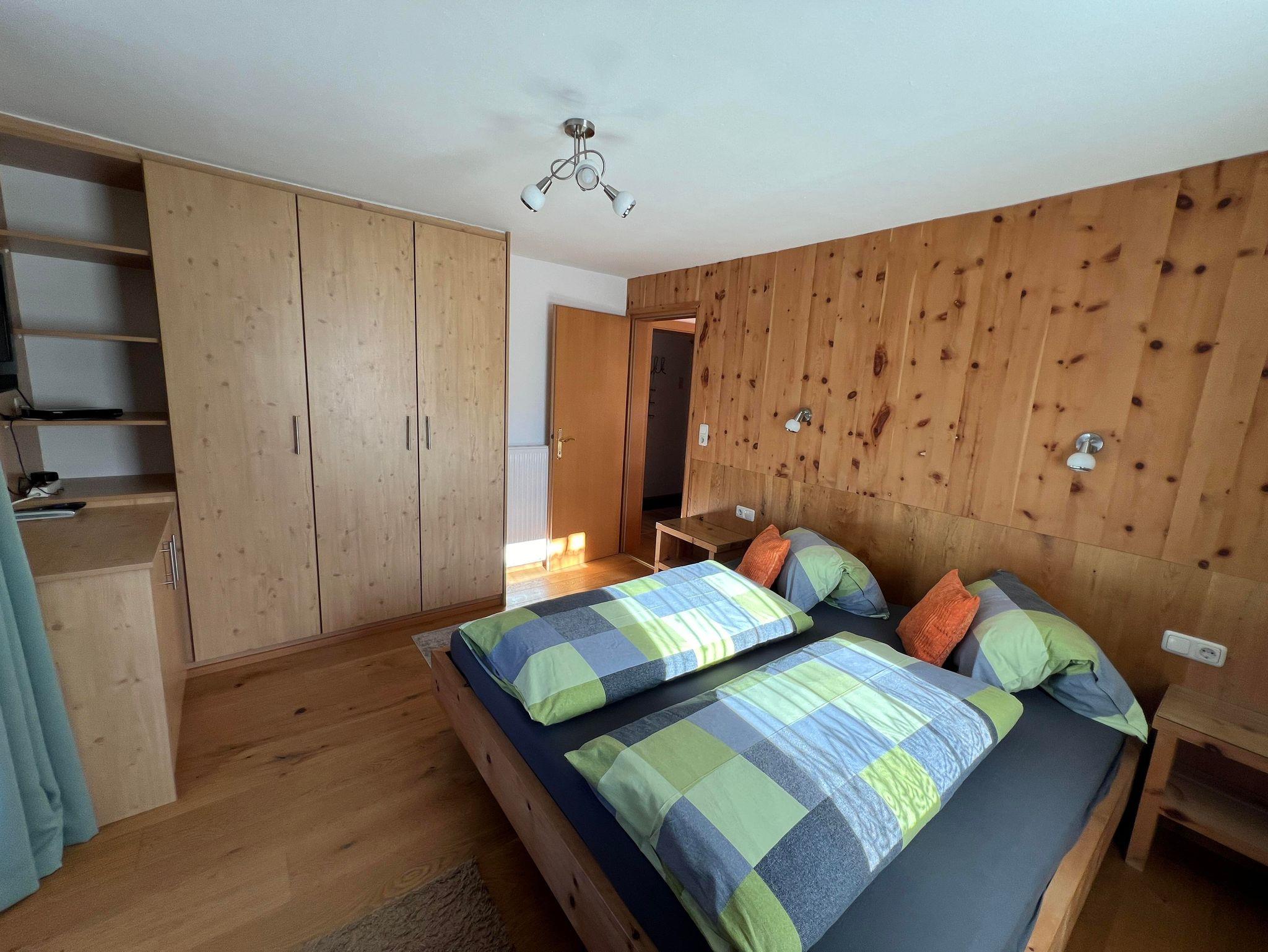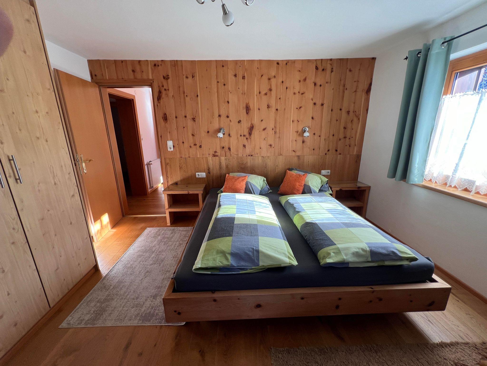 Die zwei Schlafzimmer in der Ferienwohnung, sind mit Naturholzböden und Betten und Möbel aus Zirbenholz ausgestattet.