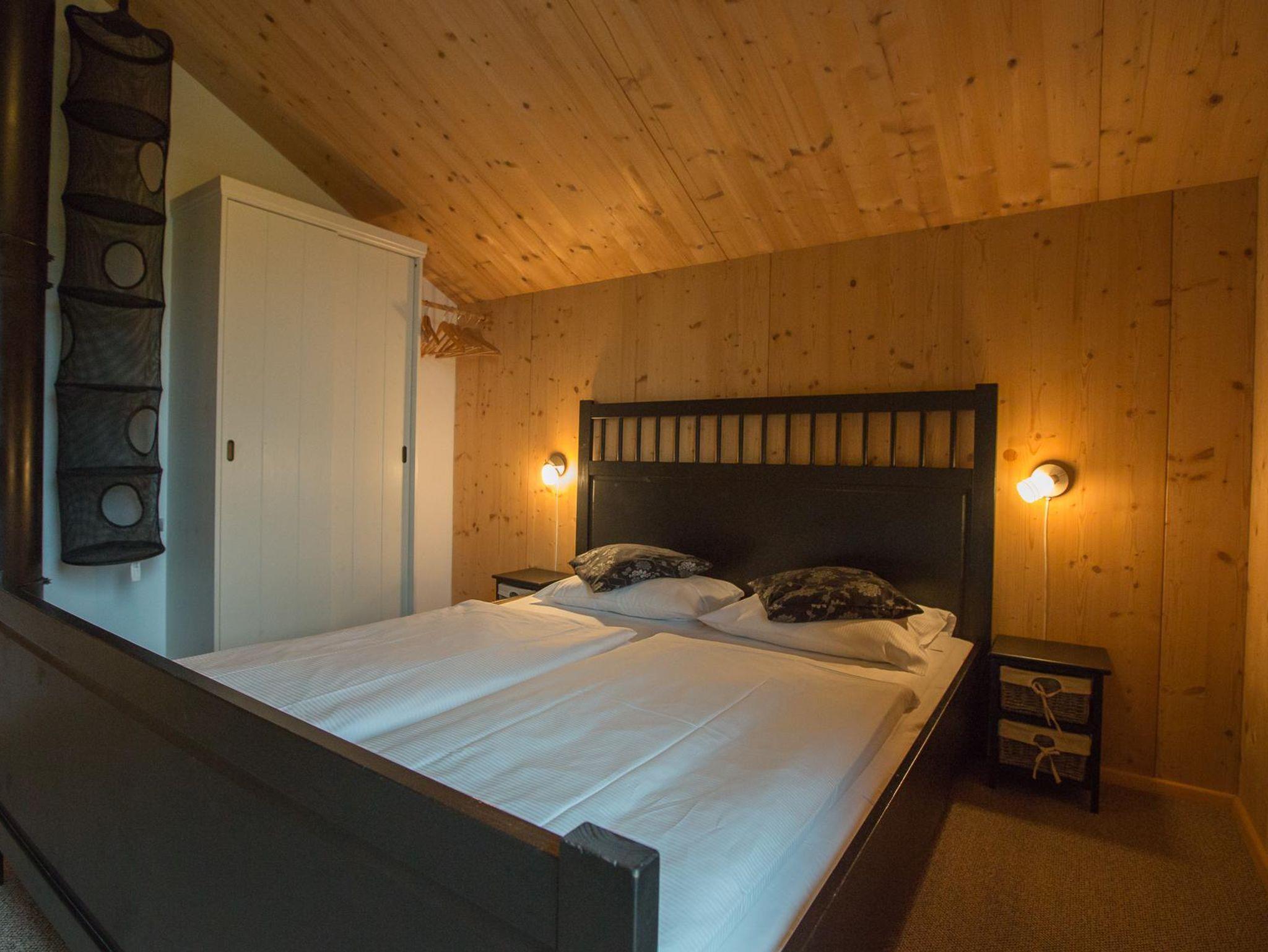Ferienhaus (105 m²) für 8–10 Personen mit 4 Schlafzimmern (3 Doppelbetten, 1 Stockbett) und Schlafsofa im Wohnbereich. Zwei Bäder (Dusche/WC, Dusche separat, zusätzlich WC). Voll ausgestattete Küche (Backofen, Kühlschrank mit Gefrierfach, Geschirrspüler, Wasserkocher, Kaffeemaschine, Toaster, Besteck). Wohnbereich mit Sitzgruppe, Essecke, Gasofen. Terrasse, Balkon, WLAN, Kabel-TV, Radio, Zimmersafe. Starterset bei Anreise.