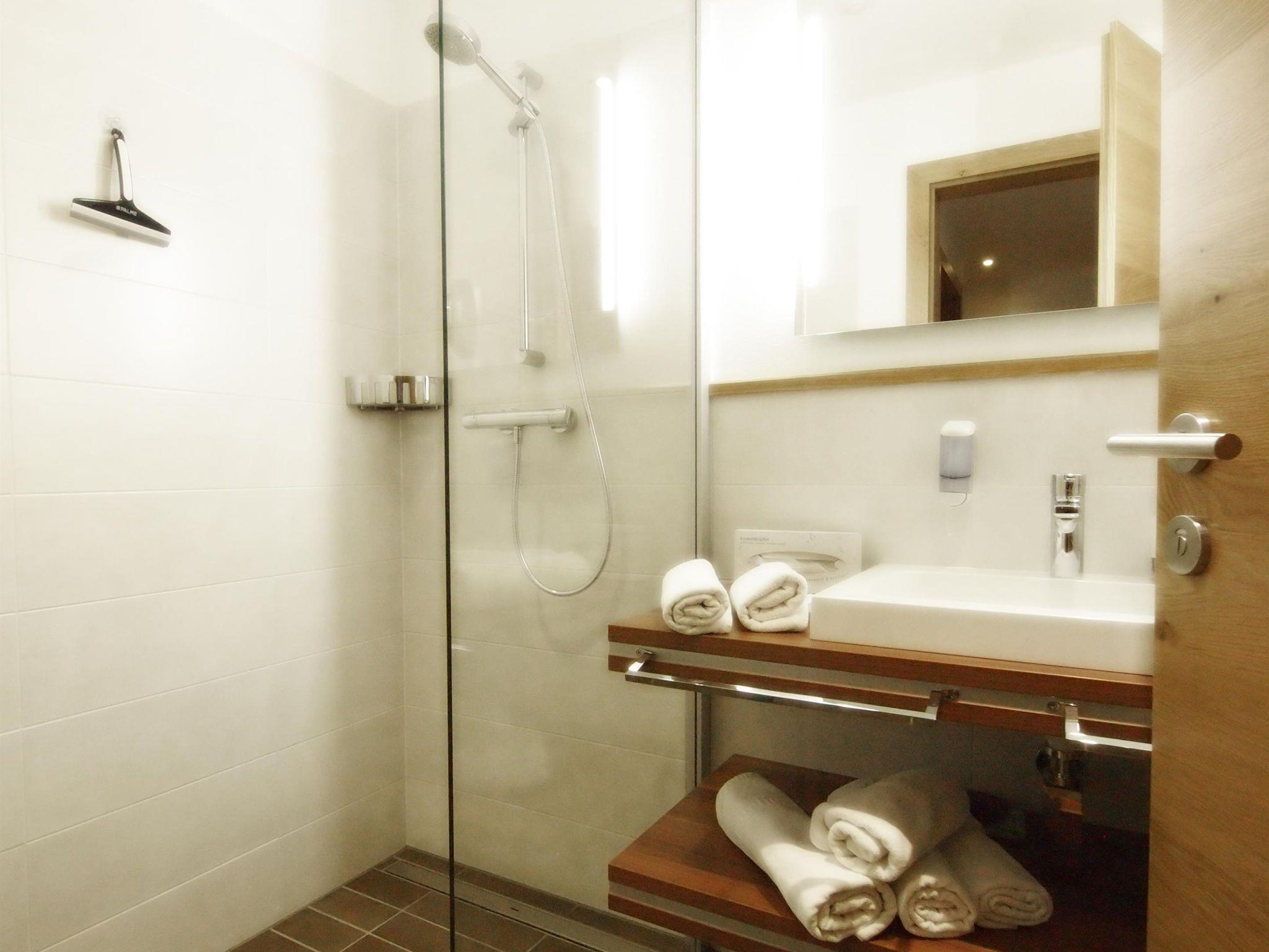modernes Badezimmer mit Dusche, Föhn, Kosmetikspiegel sowie Handtuchtrockner.