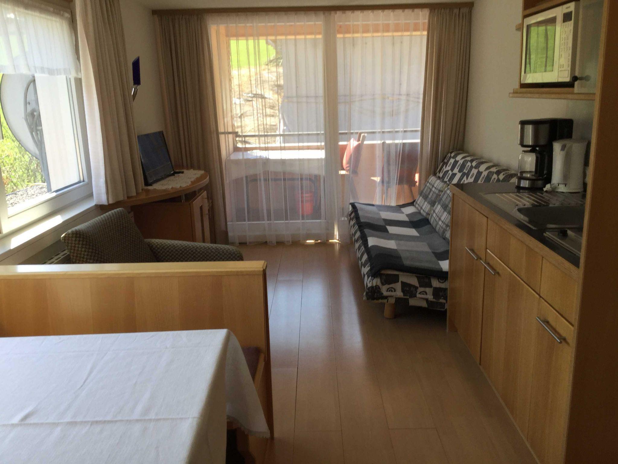 Familien-Appartement mit Küche, Wohnschlafzimmer mit Ausziehcouch für 2 Personen, Schlafzimmer für 3 Personen, Dusche/WC, TV und Balkon. Internet.