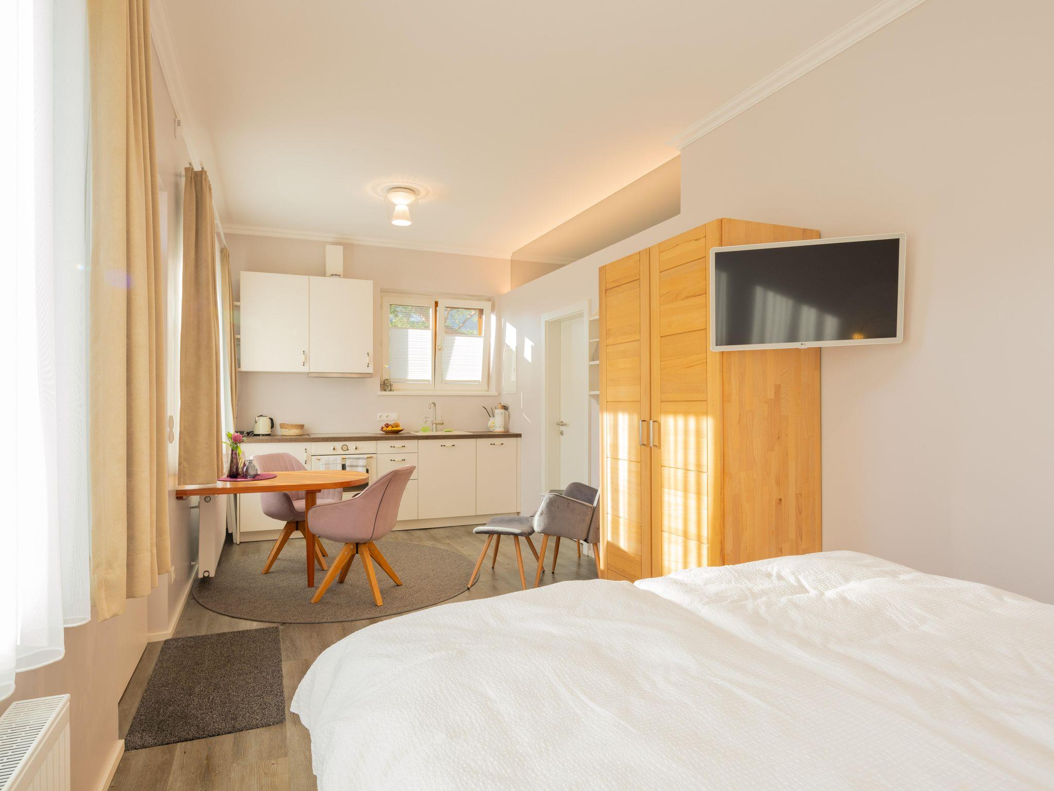 Die Ferienwohnung mit einer größe von 60 m² bietet mit einem Doppelzimmer und einer hochqualitativen Schlafcouch (140 cm breit) Platz für bis zu 4 Personen. Sie ist sehr stilvoll eingerichtet und zentral gelegen. Öffentliche Parkplätze befinden sich gegenüber der Unterkunft