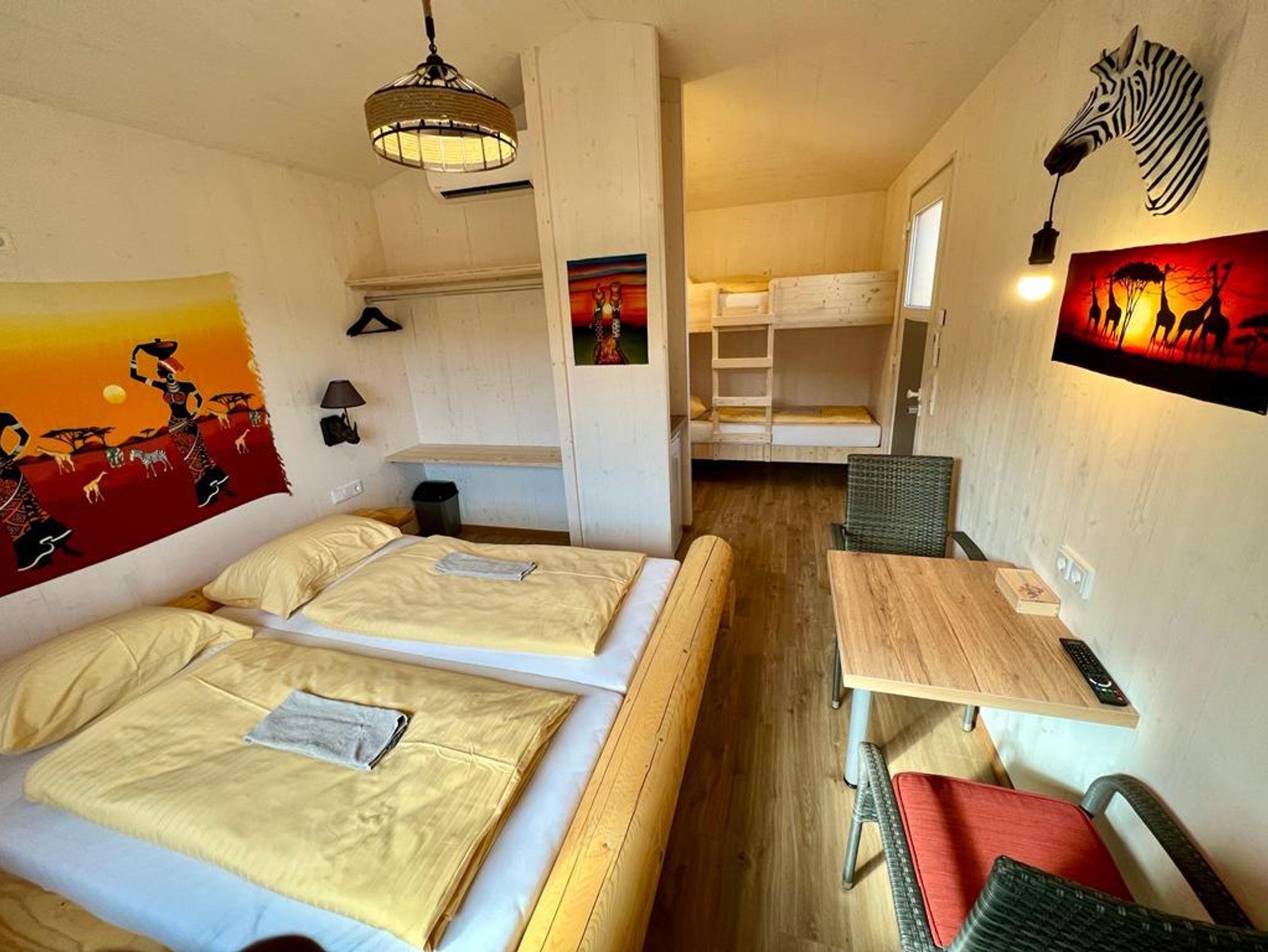 Das Baumhaus Afrika 2.4 befindet sich direkt neben dem Dinorestaurant und hat neben 2 Stiegenaufgängen auch einen Lift. Dieses Zimmer ist mit einem Doppelbett, einem Stockbett sowie einem Badezimmer mit WC, Dusche, Waschbecken als auch einem Kühlschrank sowie TV und einer kleinen Sitzecke und einer Terrasse ausgestattet.