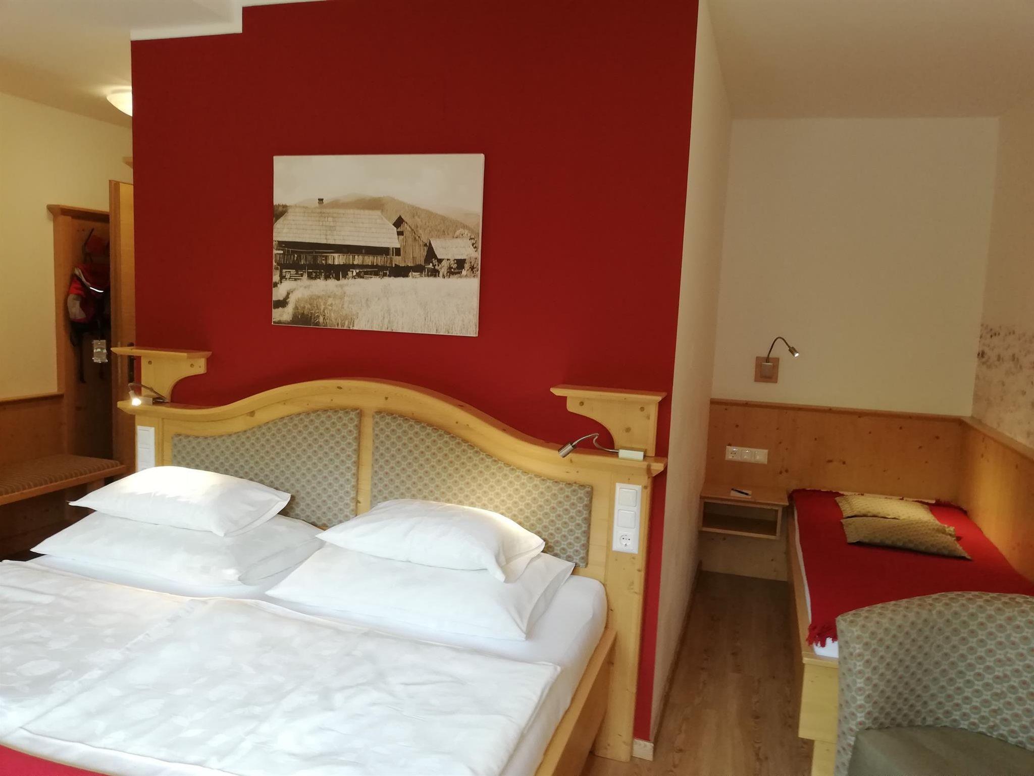 Kuscheliges 25m² Doppelzimmer in heimischer Fichtenholzausführung, Doppelbett, Kleiderschrank, Sitzgruppe, Garderobe, Singlebett, Flat-TV, Minibar, Dusche/WC, WLAN kostenlos! In unserem Doppelzimmer genießen sie ein reichhaltiges Frühstück, das ganz im Zeichen der Region steht. Wir servieren ausschließlich Produkte von lokalen Produzenten aus der Region: Nockfleisch, Mallhof, Weißensteiner, Gutzinger Hof, Kärntner Milch sowie Honig aus St. Oswald. So schmeckt Heimat!
