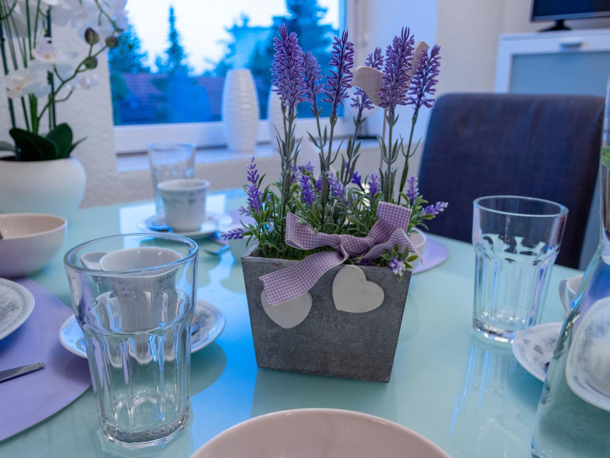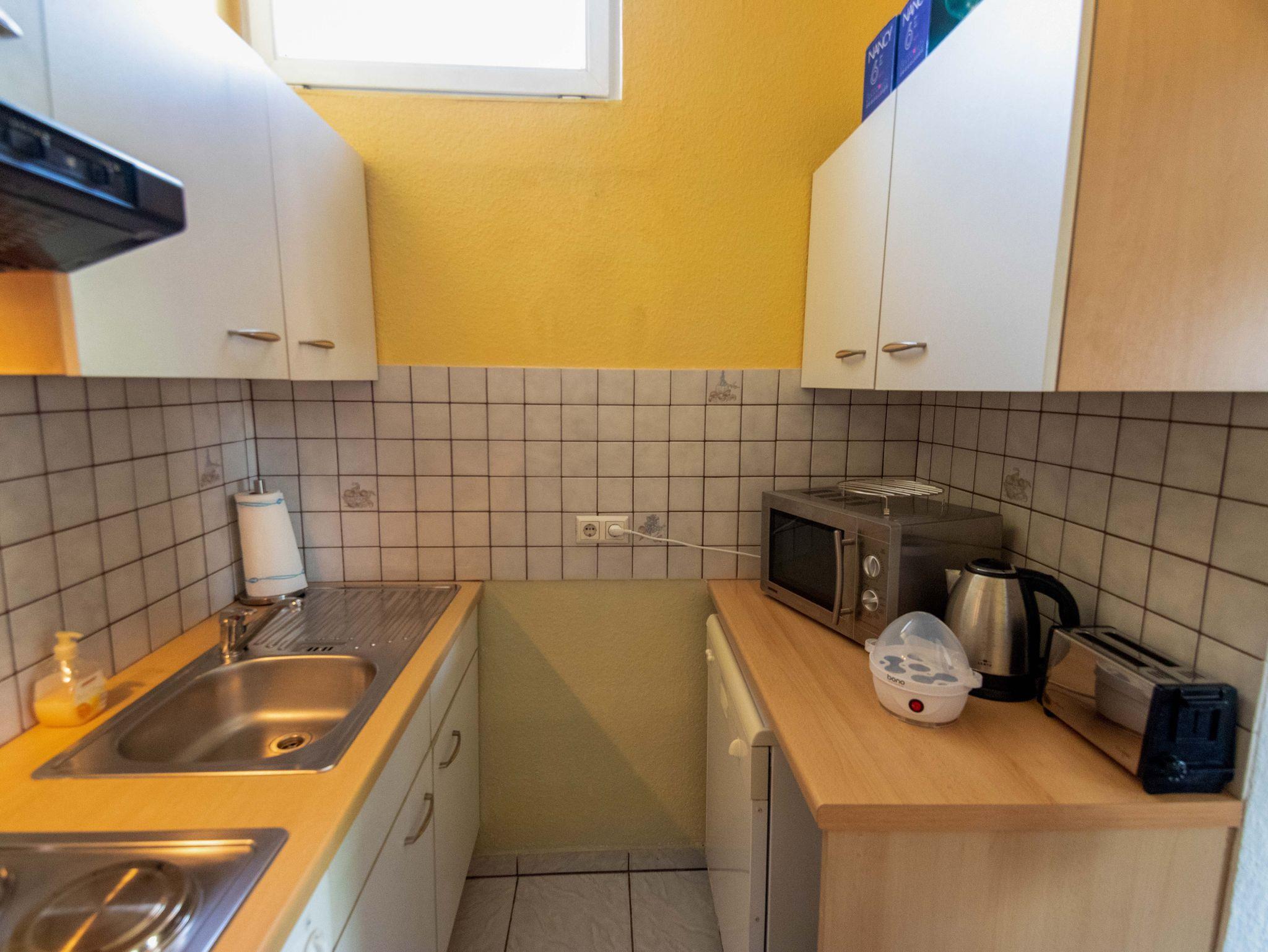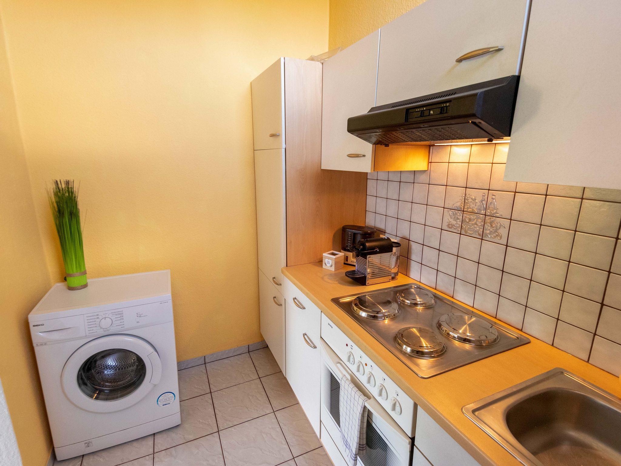 Die Küche ist komplett ausgestattet mit Herd, Backofen, Kühlschrank, Geschirrspüler, Mikrowelle, Nespresso-Kaffeemaschine, Wasserkocher, Eierkocher und natürlich sämtlichem Geschirr, Weingläsern, Töpfen und Pfannen. Weiters ist hier auch eine Waschmaschine vorhanden.