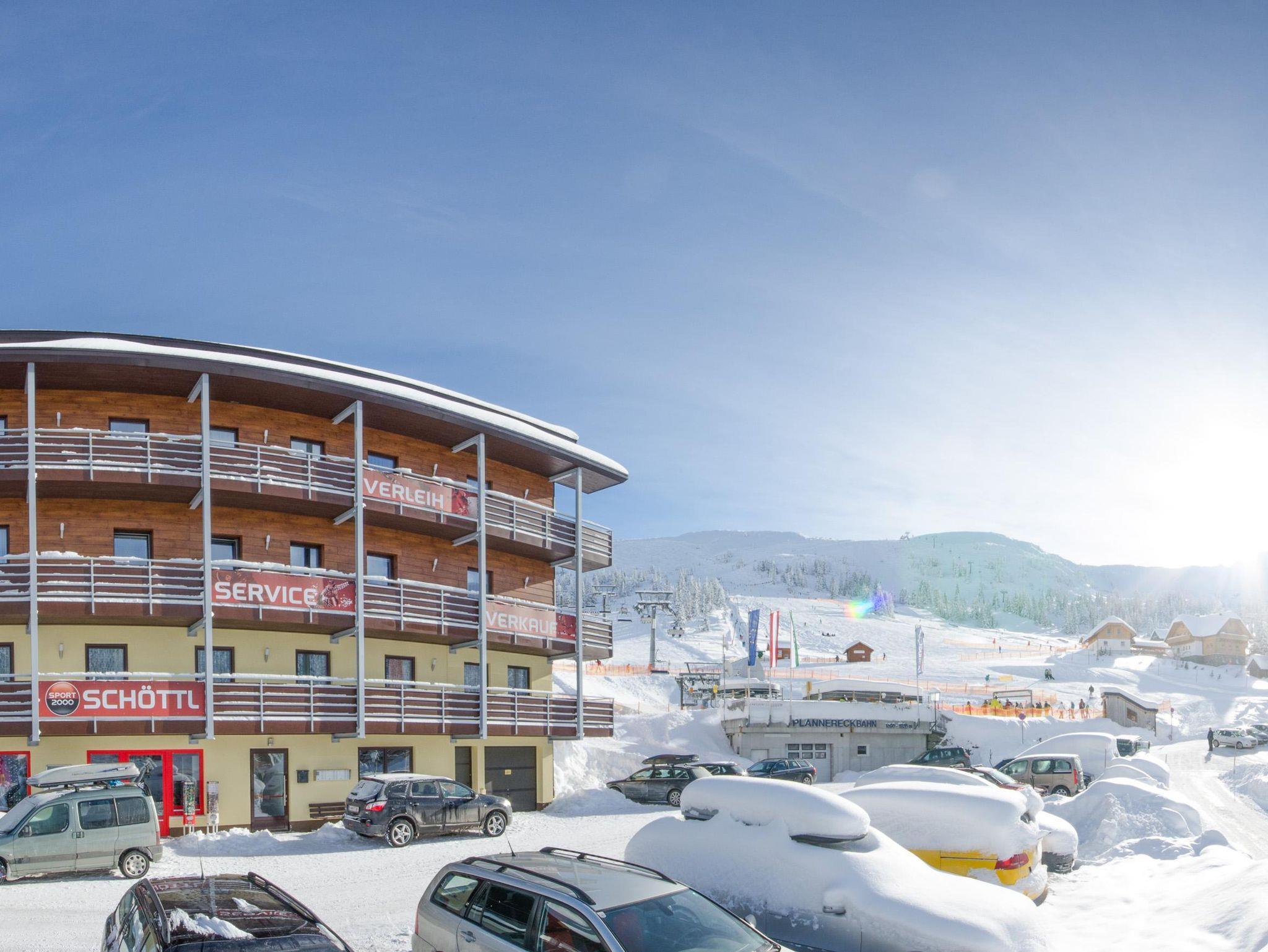 IRDNING-DONNERSBACHTAL/PLANNERALM. Direkt im Skigebiet Planneralm gelegen. Unser Haus bietet 18 Ferienwohnungen von 15 bis 76 m² (für 1 bis 8 Personen) und liegt direkt neben dem Sessellift. Die Wohnungen bestehen aus Vorraum, teilweise mit Balkon, DU/WC, Wohnküche, bis zu 3 Schlafzimmern. Komfortable Ausstattung mit E-Herd, Kühlschrank, Kaffeemaschine, Nespresso Maschine, Mikrowelle, Geschirrspüler, Sat-TV, großzügigem Geschirrinventar, Bettwäsche und Handtüchern sowie W-Lan. Zusätzlich steht im Aufenthaltsraum ein Drehfußballtisch sowie eine Billardtisch und ein TT-Tisch. Sportgeschäft und Lebensmittel im Haus (nur in der Wintersaison geöffnet). Inklusive Strom, Bettwäsche, Endreinigung, gesetzlicher Nächtigungsabgabe