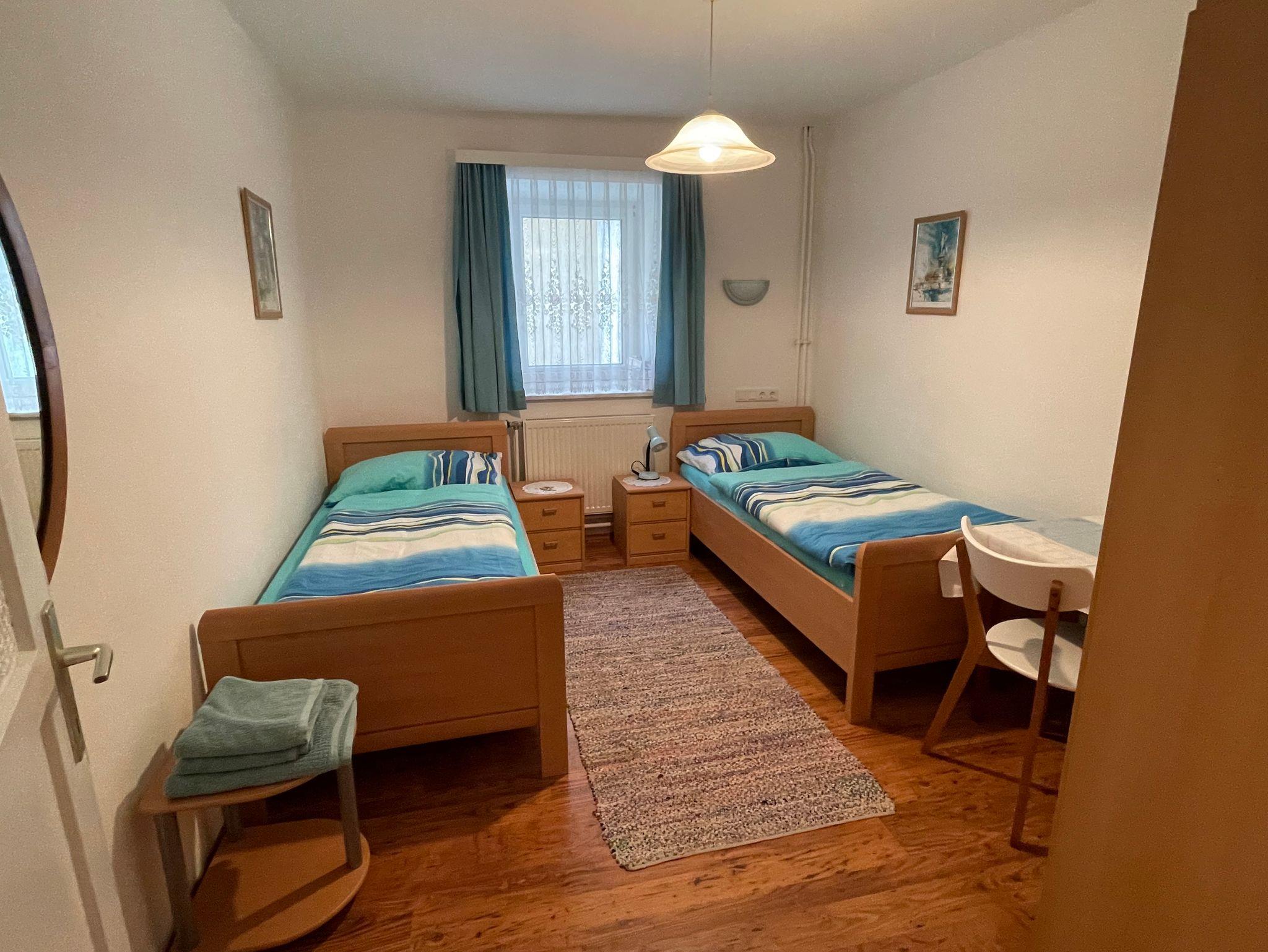 Unsere kleine Ferienwohnung mit 55qm² bietet Platz bis zu 4 Personen. Sie verfügt über 1 Doppelbett und 1 Schlafsofa, zusätzlich ein Zimmer mit 2 Einzelbetten sowie einem voll ausgestatteten Küchenblock, SAT TV, ein Duschbad und ein separates WC.