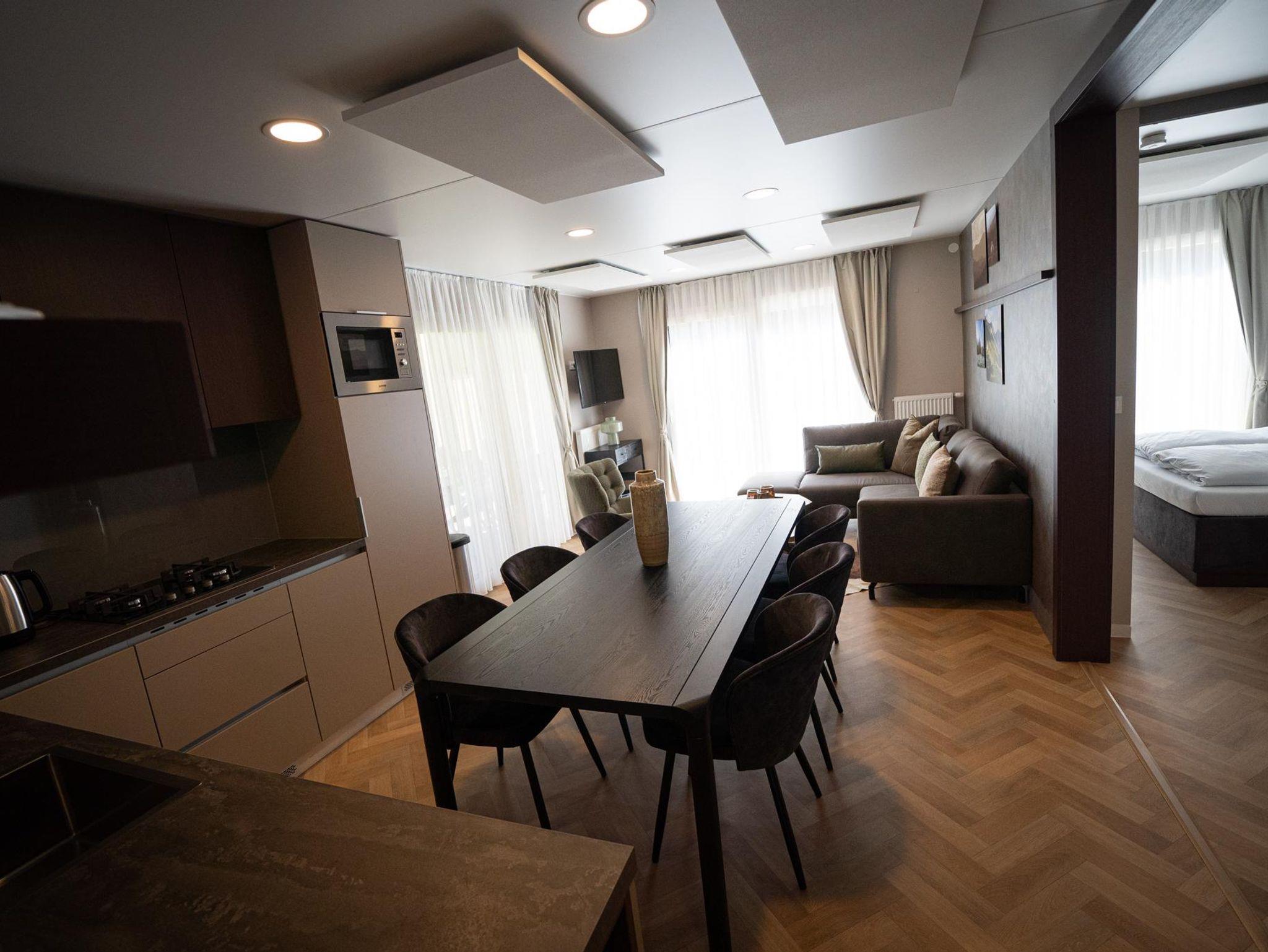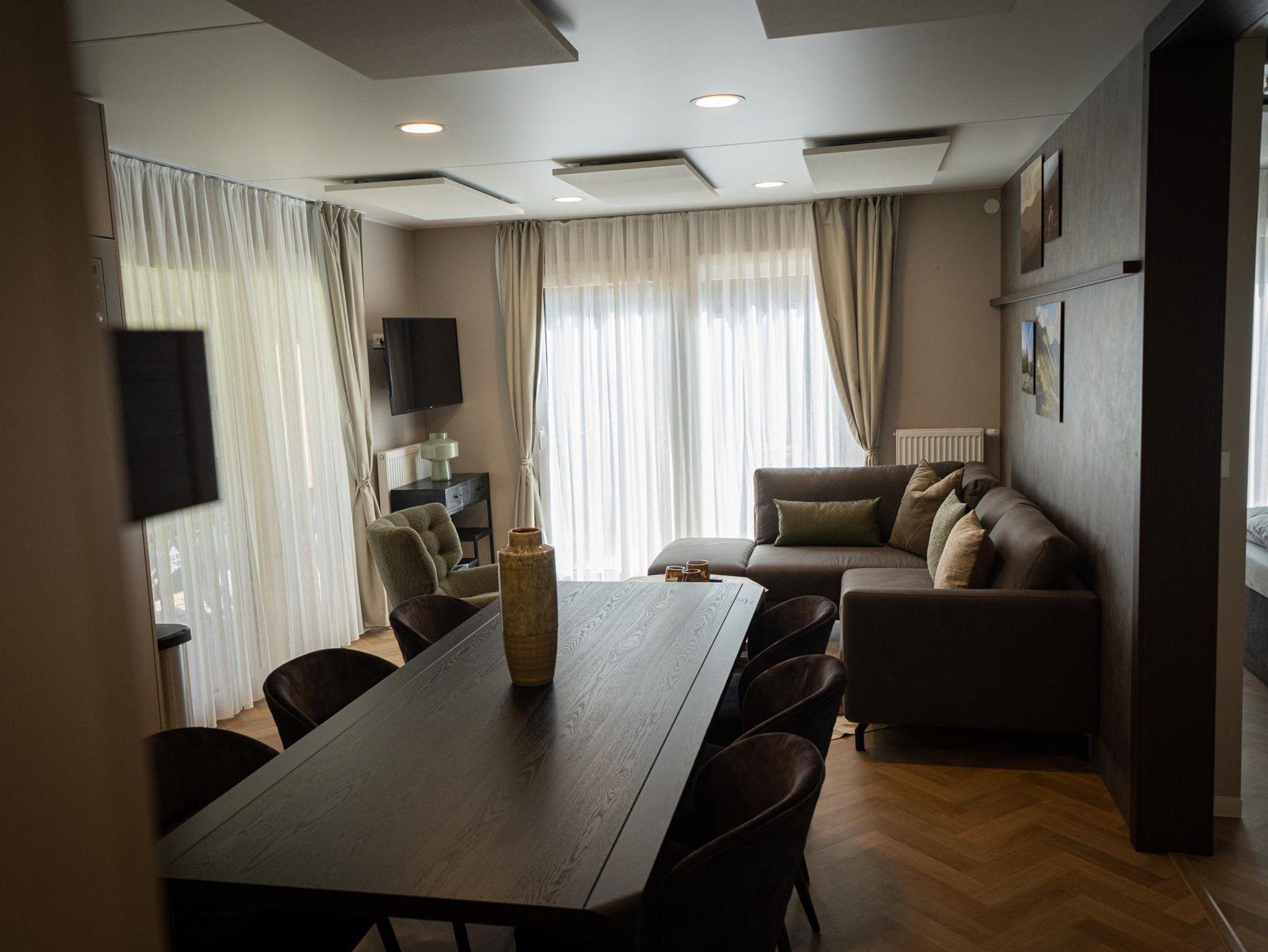 Hier wird Gemütlichkeit großgeschrieben. Das großzügige Wohnzimmer mit viel Tageslicht und direktem Zugang zur Terrasse lädt Gäste zum Entspannen ein. Die Unterkunft verfügt darüber hinaus über drei Schlafzimmer, eines davon mit einem Doppelbett und zwei Zimmer mit jeweils zwei Einzelbetten. Die Küche ist mit allem ausgestattet, was zum Kochen benötigt wird. Weiters gibt es ein luxuriöses Badezimmer mit begehbarer Dusche, Waschbecken, freischwebendem WC sowie eine separate Toilette mit Waschbecken. Der großzügig bemessene Stauraum rundet den hohen Wohnkomfort ab. Die Terrasse mit gemütlichen Sitzmöglichkeiten bietet einen Ort des Zusammensitzens und Genießens.