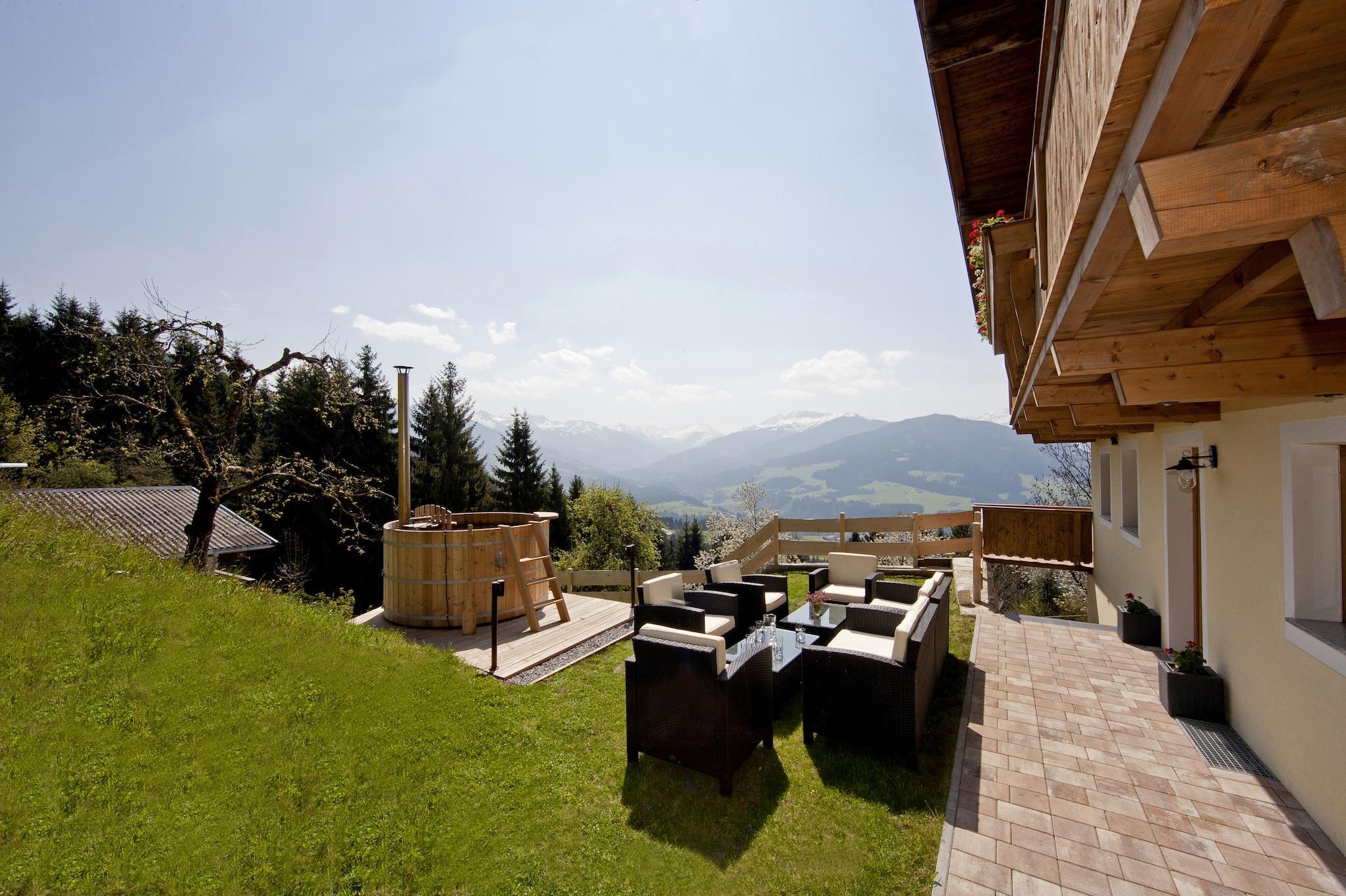This beautiful detached chalet for a maximum of 11 people is located in Hopfgarten im Brixental in Tyrol, in the middle of the mountains at an altitude of 1030 meters, and offers breathtaking views of the Kitzbühel Alps. The chalet has a spacious living room with a sofa bed, an open fully equipped kitchen-living room with dining table, 4 large bedrooms (one with an extra single bed) and 2 modern bathrooms. You can park directly in the underground car park, where there is also a ski storage room. The chalet also offers a beautiful garden with a terrace where there is also a wood-heated hot tub. Hopfgarten in the Brixental with the impressive panoramic Hohe Salve mountain is one of the sunniest communities in the Kitzbühel Alps and offers a number of hiking and cycling trails as well as excursion destinations in the varied Tyrolean mountains. The Hohe Salve panoramic mountain is connected to the Wilder Kaiser mountaineering and winter sports paradise. In Hopfgarten im Brixental, the SkiWelt Wilder Kaiser-Brixental ski area has 90 lifts, over 70 huts, several fun parks, ski movie trails and, together with the adjacent KitzSki ski area, offers a total of over 500 kilometers of slopes. Especially in winter, please note that the last 3 km to the chalet are on a steep asphalt mountain road where snow chains are required. Please note: There is a fee for using the washing machine and dryer. Please indicate your dog's presence when booking so we can accommodate you accordingly.