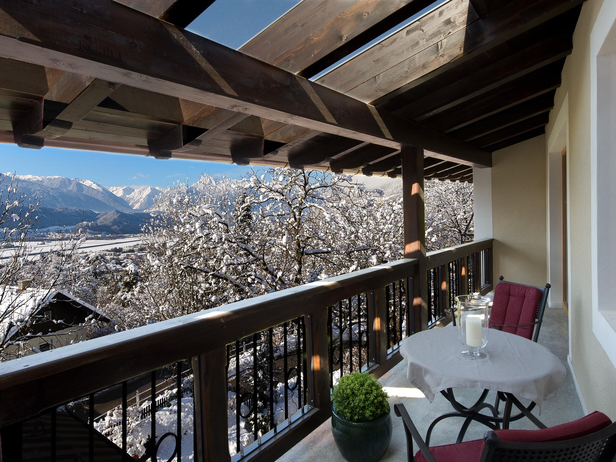 Die ersten Sonnenstrahlen erwarten Sie im Bad unseres Appartements "Morgensonne". Wenn Sie möchten, können Sie sich auch einen Stuhl schnappen und die Sonne auch auf der Veranda mit Blick auf die majestätische Nordkette begrüßen.
