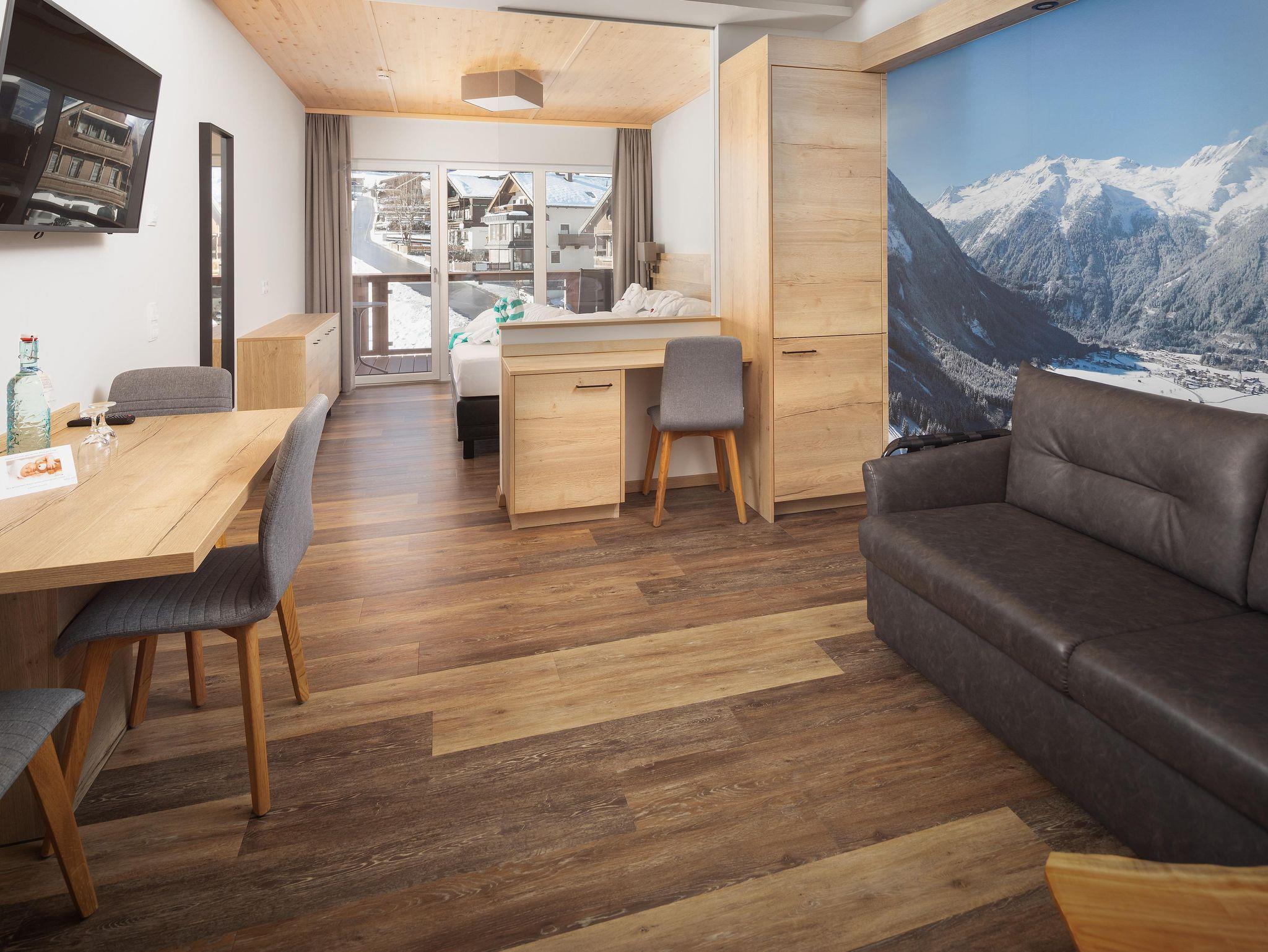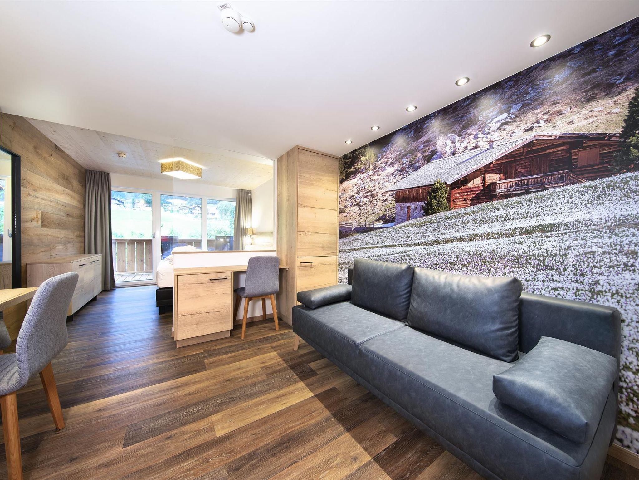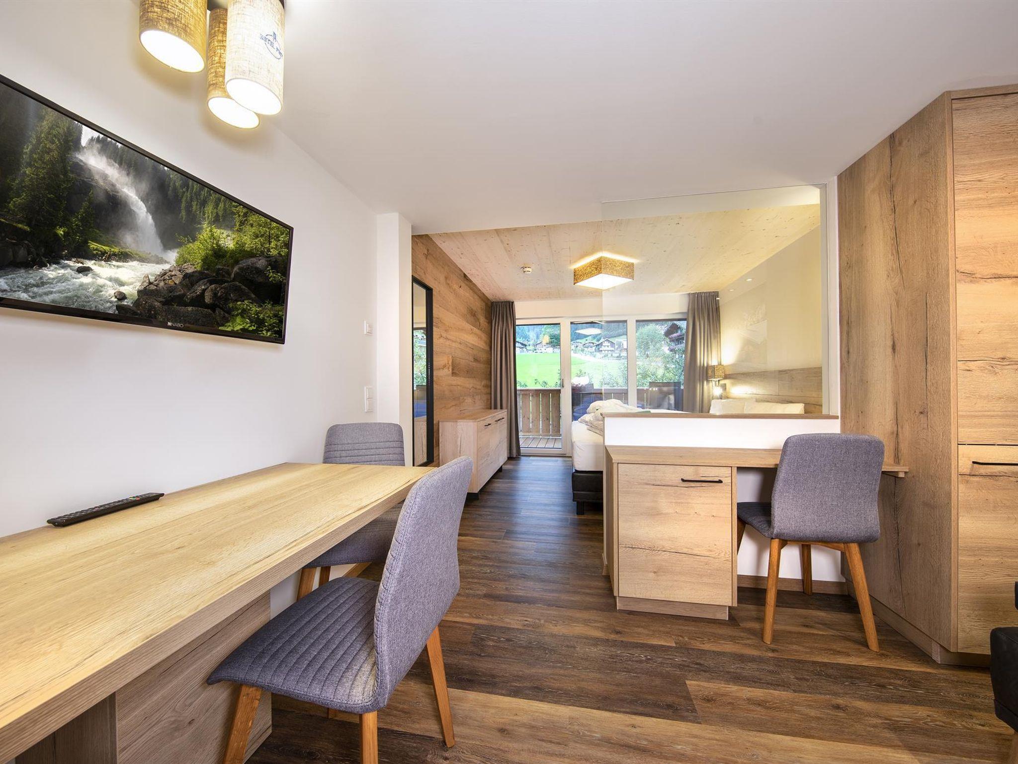 Die im Frühjahr 2019 komplett neu renovierten Hotelappartements (1-4 Personen) im alpin-modernen Design wurden mit natürlichen Materialien ausgestattet. Von Ihrem Balkon oder der Terrasse aus genießen Sie den Panoramablick auf die Krimmler Wasserfälle. Die allergikergerechte Ausstattung sorgt für Wohnkomfort mit höchsten Ansprüchen. Das Hotelappartement wird optisch in Wohn- und Schlafraum getrennt