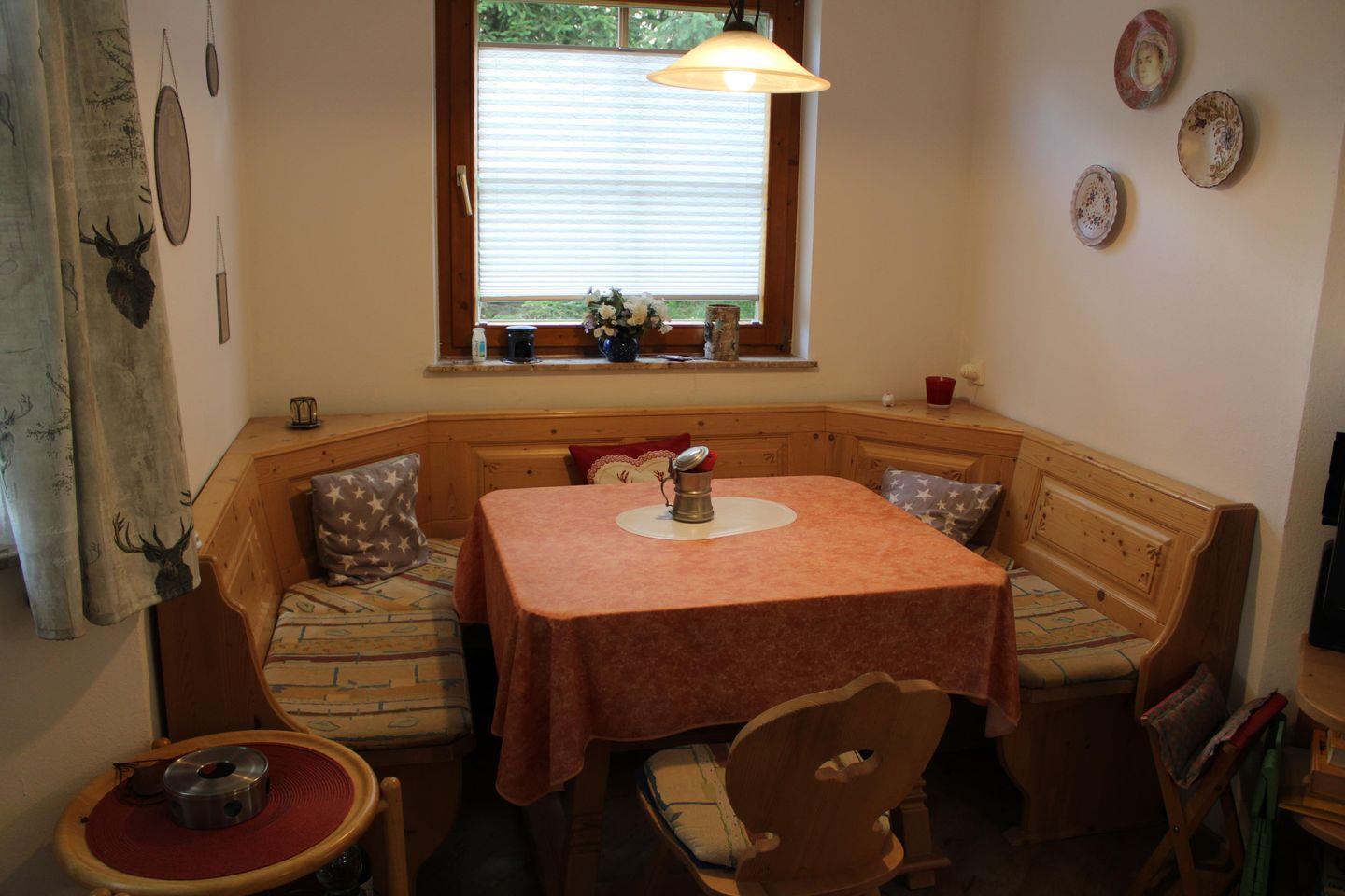 So bietet die gut ausgestattete, offene Küche viel mehr Möglichkeiten als die bloße Zubereitung kleiner Snacks. Die rustikal-gemütliche Essecke lädt zu gemeinsamen Abenden im Kreise der Familie ein.