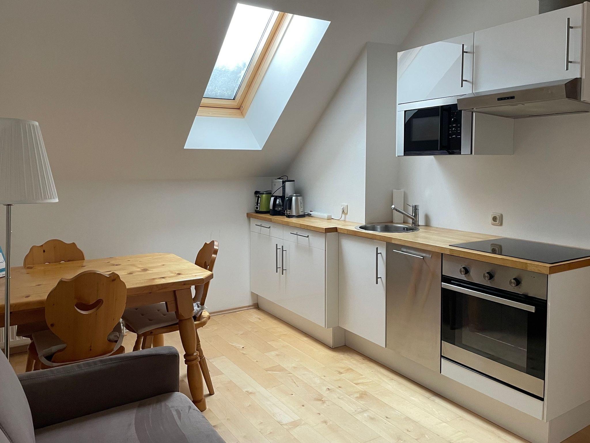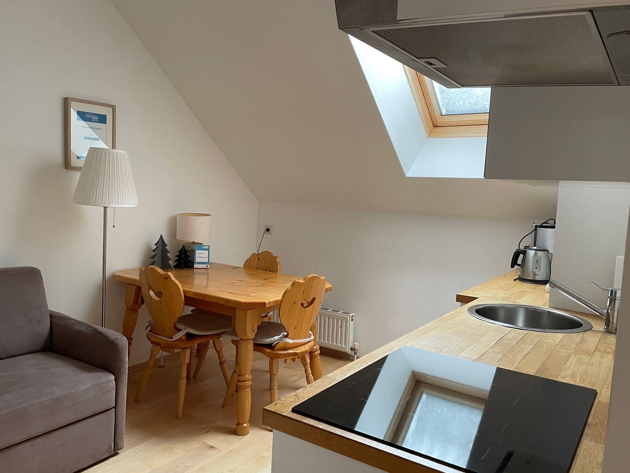 Die Wohnung ist ideal für 2 Personen, in der Wohnküche gibt es eine Couch, worauf 1 kleineres Kind schlafen kann.