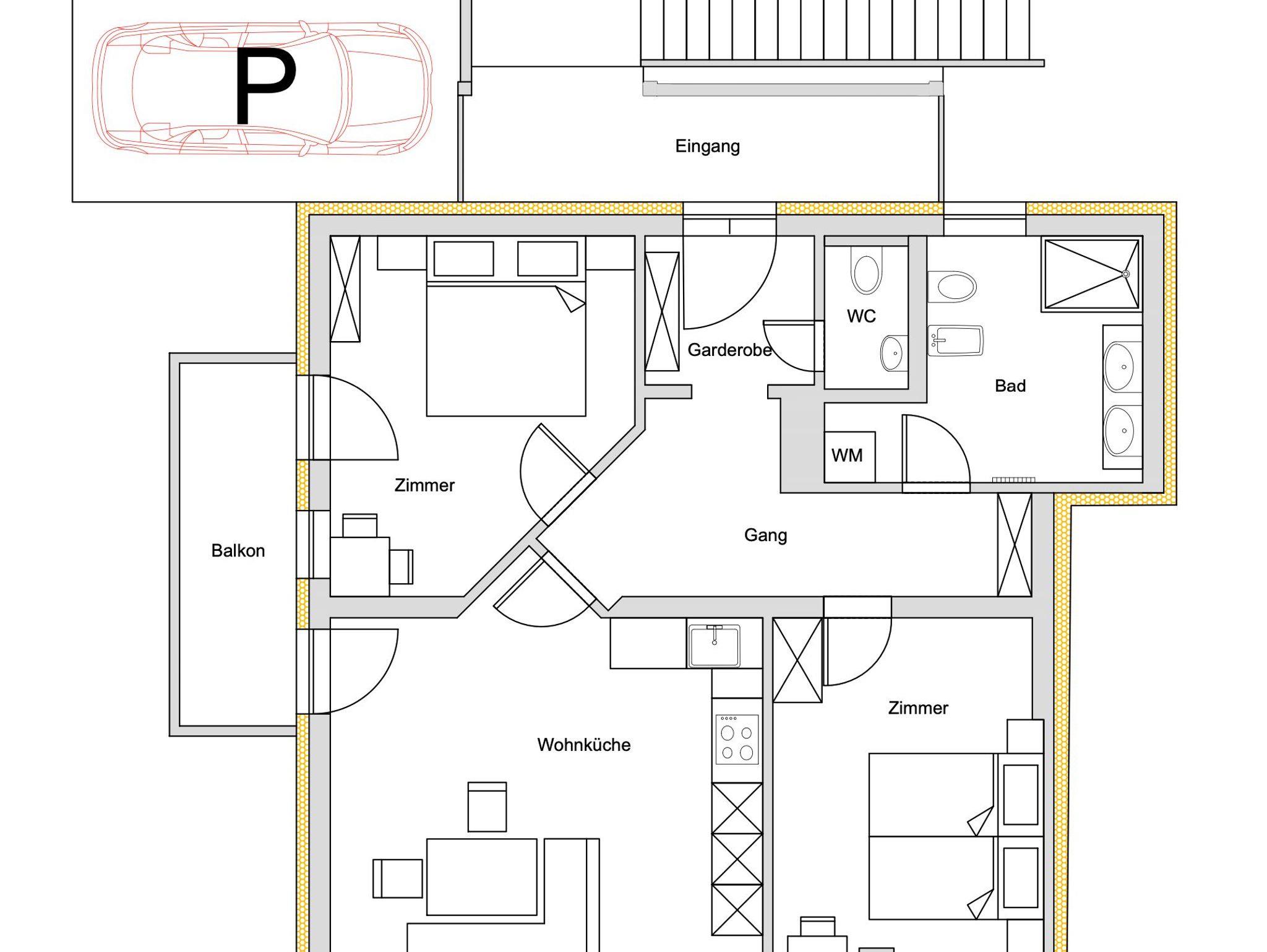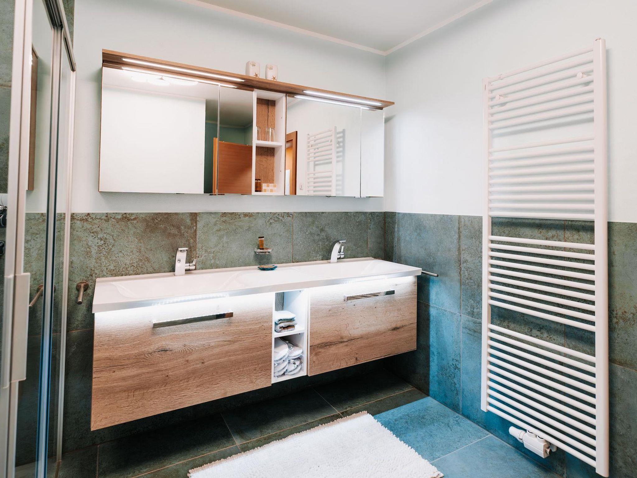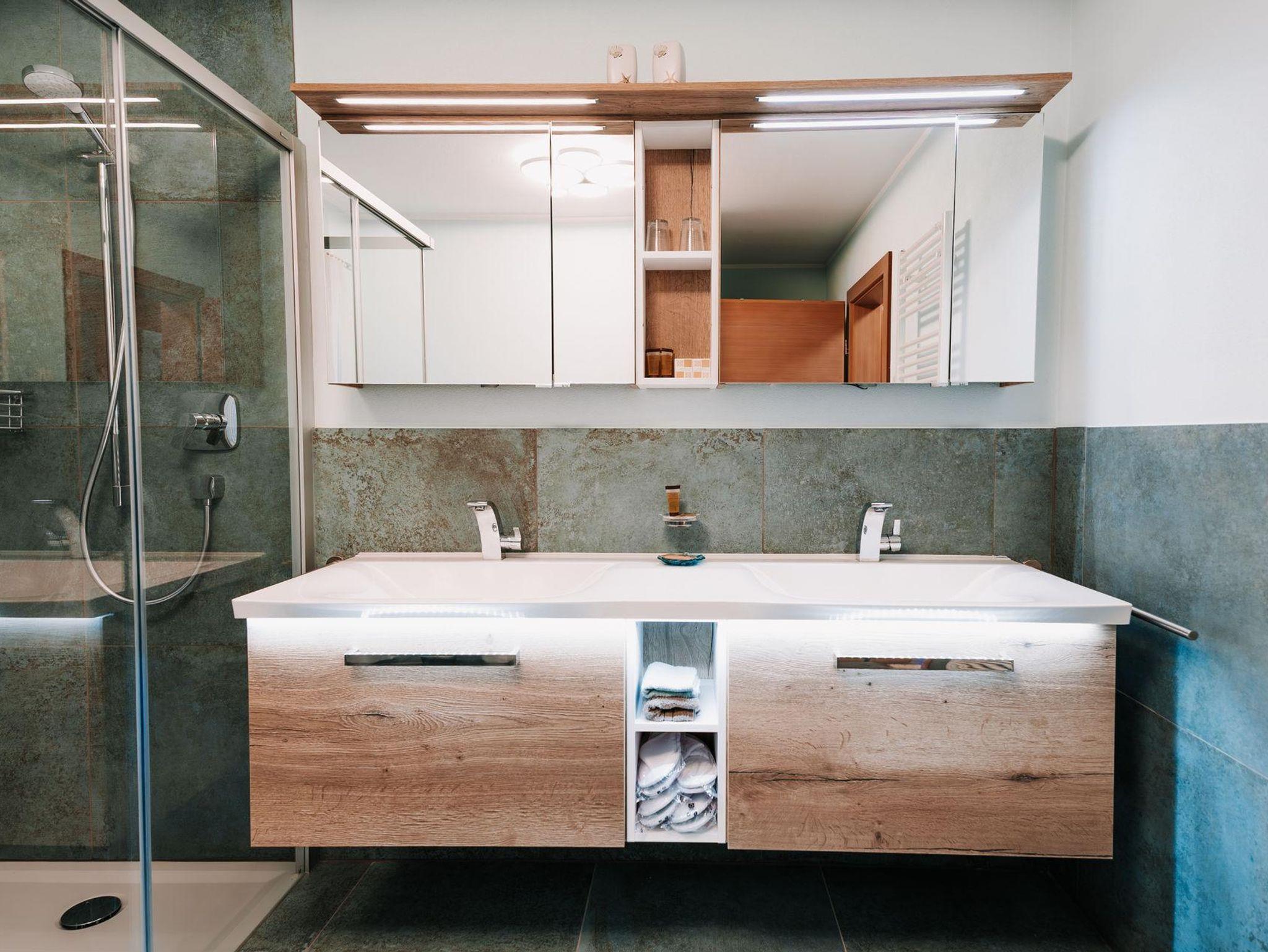 Unsere Ferienwohnung bietet Ihnen zwei Schlafzimmer Badezimmer mit Dusche, WC, Bidet und Waschmaschine, zusätzlich ein separates WC. Die voll ausgestattete Küche lässt keine Wünsche offen und enthält alle nötigen Geräte und Utensilien.