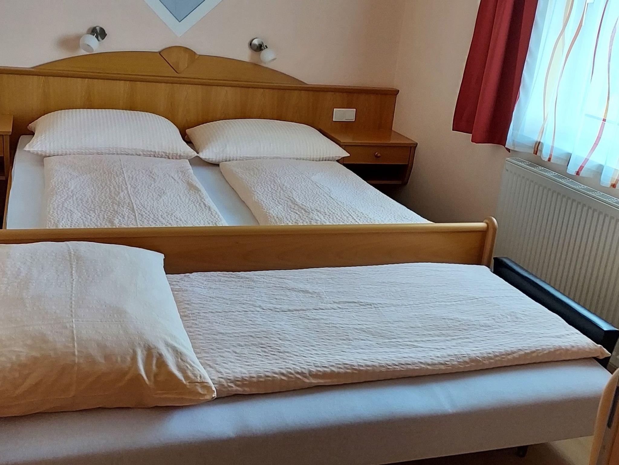 Das helle und geräumige Dreibettzimmer mit 20qm bietet einen traumhaften Blick auf die Berge. Es verfügt über ein Doppelbett und ein Einzelbett. Ein Kleiderschrank und TV befinden sich ebenfalls im Zimmer. Das Badezimmer mit Dusche oder Badewanne, WC und Fön rundet das Gesamtbild ab. Auf dem Balkon können Sie entspannte Abende verbringen. Haustiere sind gestattet. Möglicherweise fallen Gebühren an. Das WLAN und den Parkplatz vor dem Haus können Sie kostenfrei nutzen.