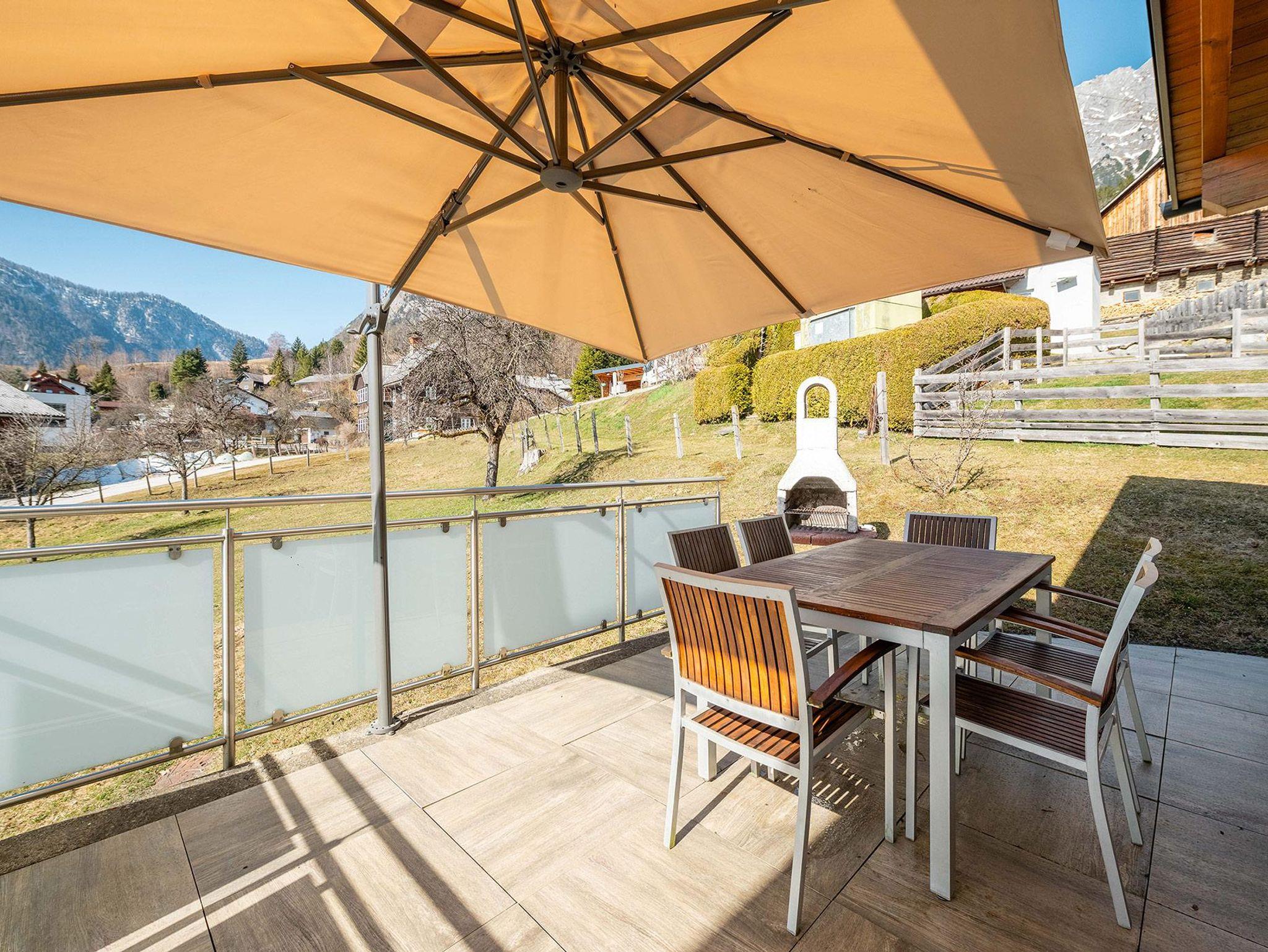 Genießen Sie entspannte Stunden auf der großen Sonnenterrasse mit Grill, während sich vor Ihnen der Blick auf die beeindruckende Bergwelt rund um den Grimming öffnet.