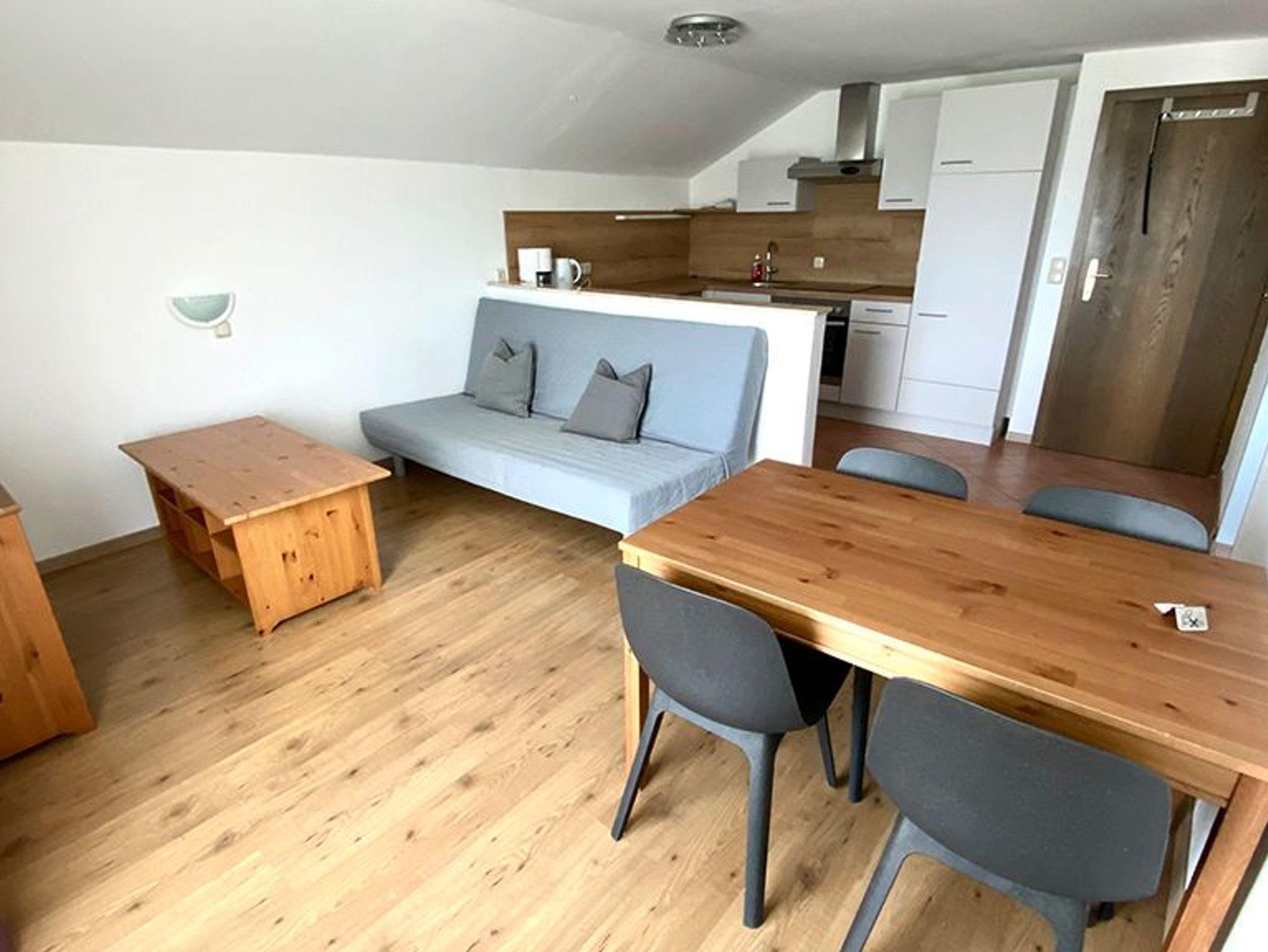 Unsere Ferienwohnung mit Balkon und Blick auf den Mondseeberg und die Drachenwand liegt im 2. Stock. Sie verfügt über eine große, voll ausgestattete Wohnküche mit Geschirrspüler und Couch, welche als Doppelbett genutzt werden kann. Angrenzend befindet sich das Schlafzimmer mit Balkon und Dusche/WC. WLAN ist in unserem Haus kostenlos, wir sind ein Nichtraucherhaus.