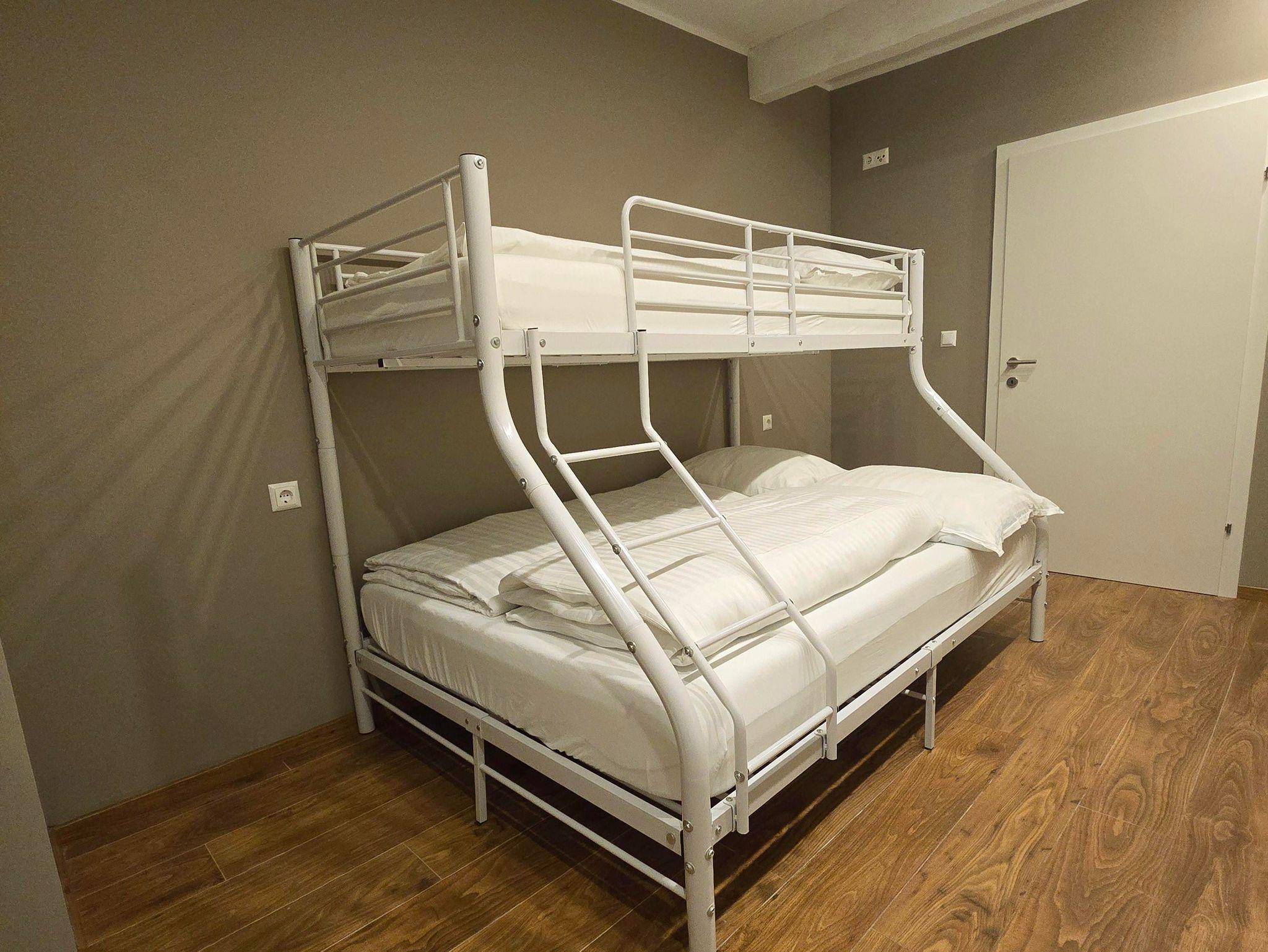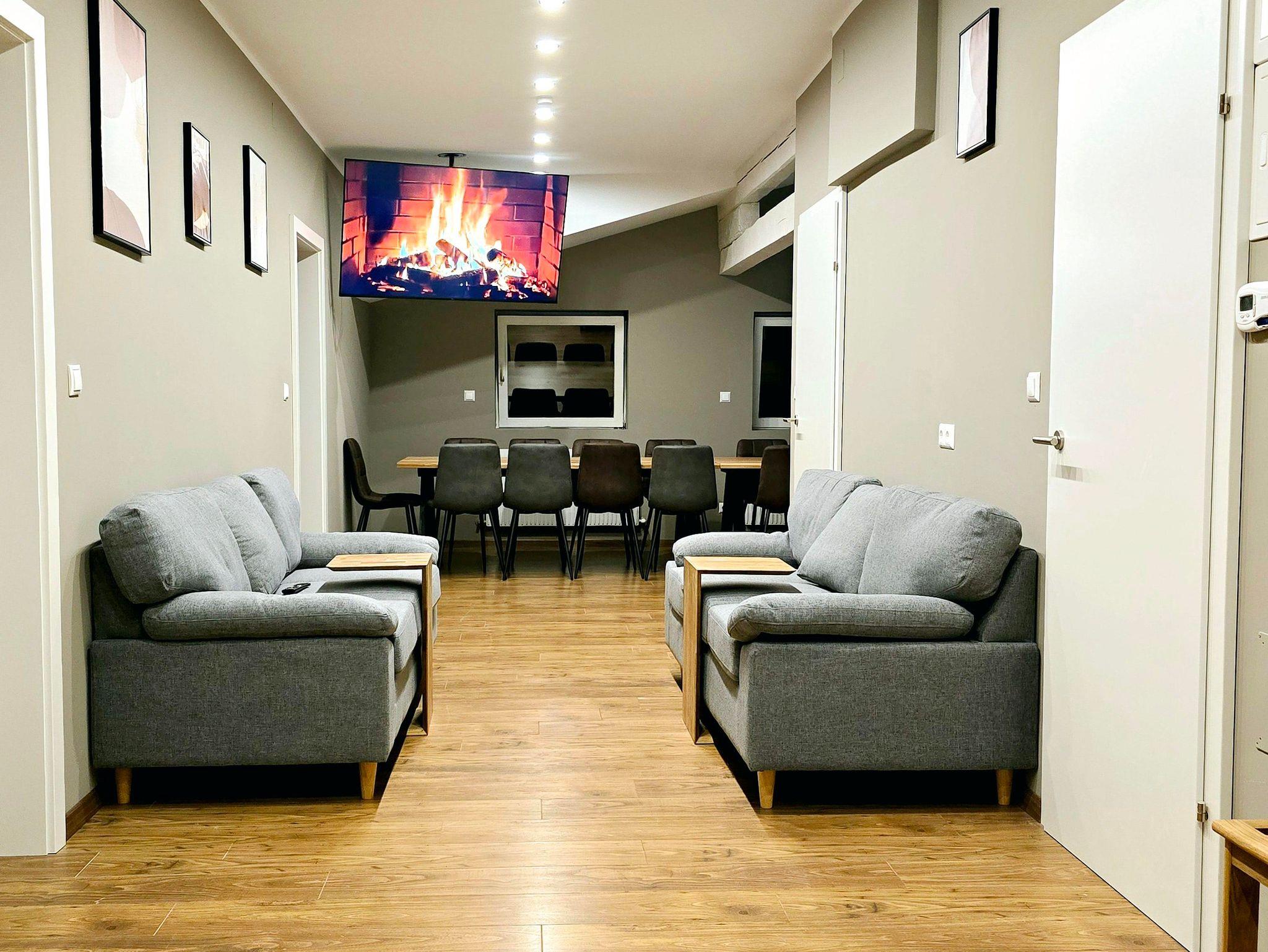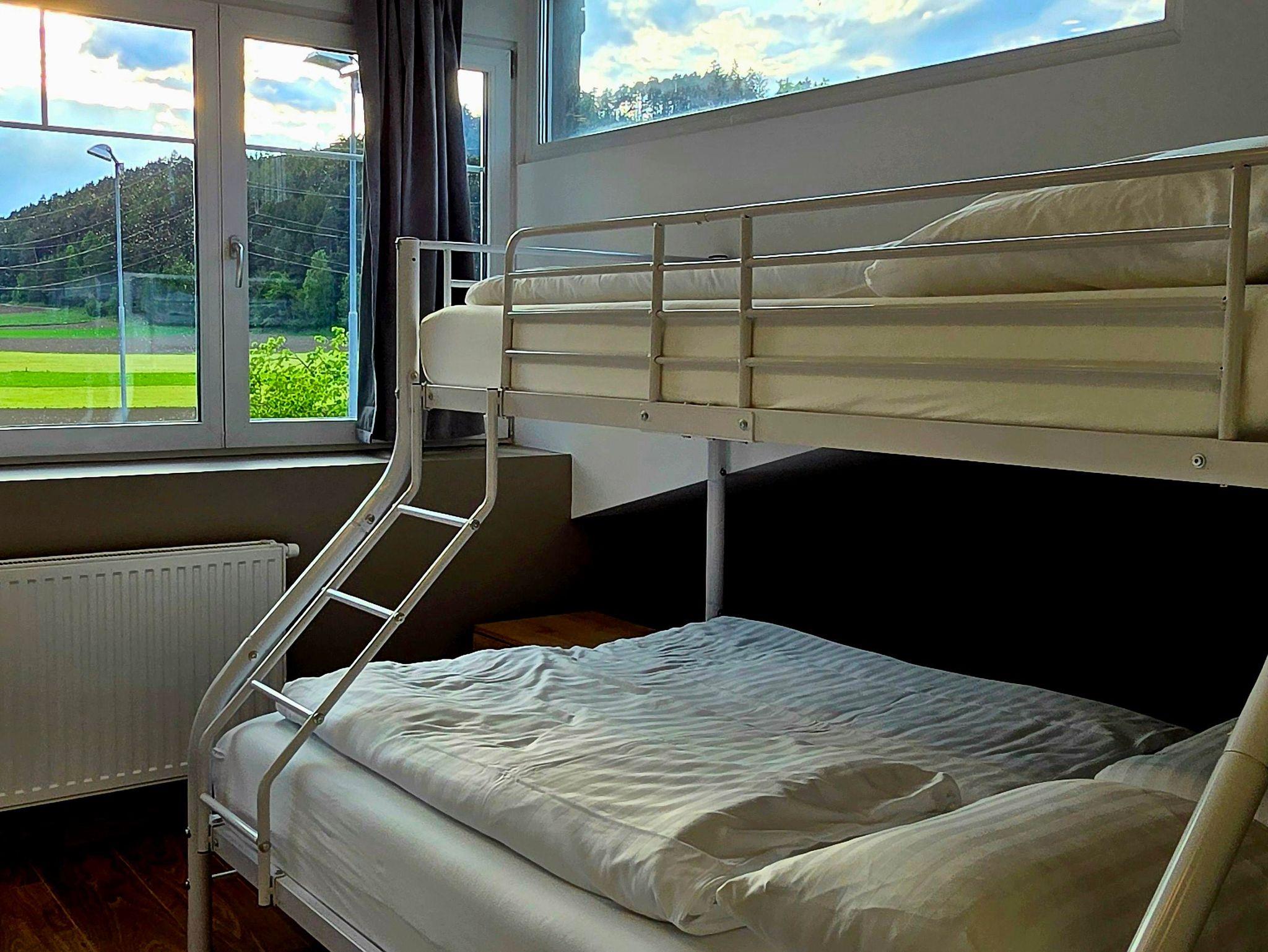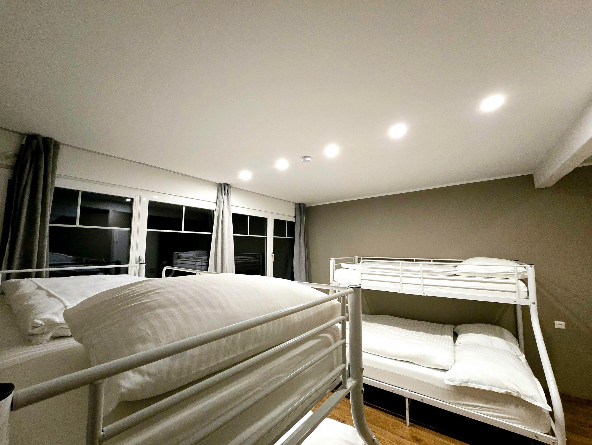 Die Penthousewohnung im Art & Sporthotel befindet sich im zweiten Stock, erstreckt sich über 160 m² und bietet Platz für bis zu 18 Personen. Es verfügt über drei Schlafzimmer, die jeweils mit zwei Dreierbetten ausgestattet sind, bestehend aus einem Doppelbett unten und einem Einzelbett oben. Die Wohnung umfasst zwei Bäder, die jeweils mit zwei Duschen und zwei Toiletten ausgestattet sind, sowie eine vollausgestattete Küche mit ausreichend Geschirr. Ein großer Esstisch und eine Sitzecke mit zwei Couches und einem TV bieten zusätzlichen Komfort.