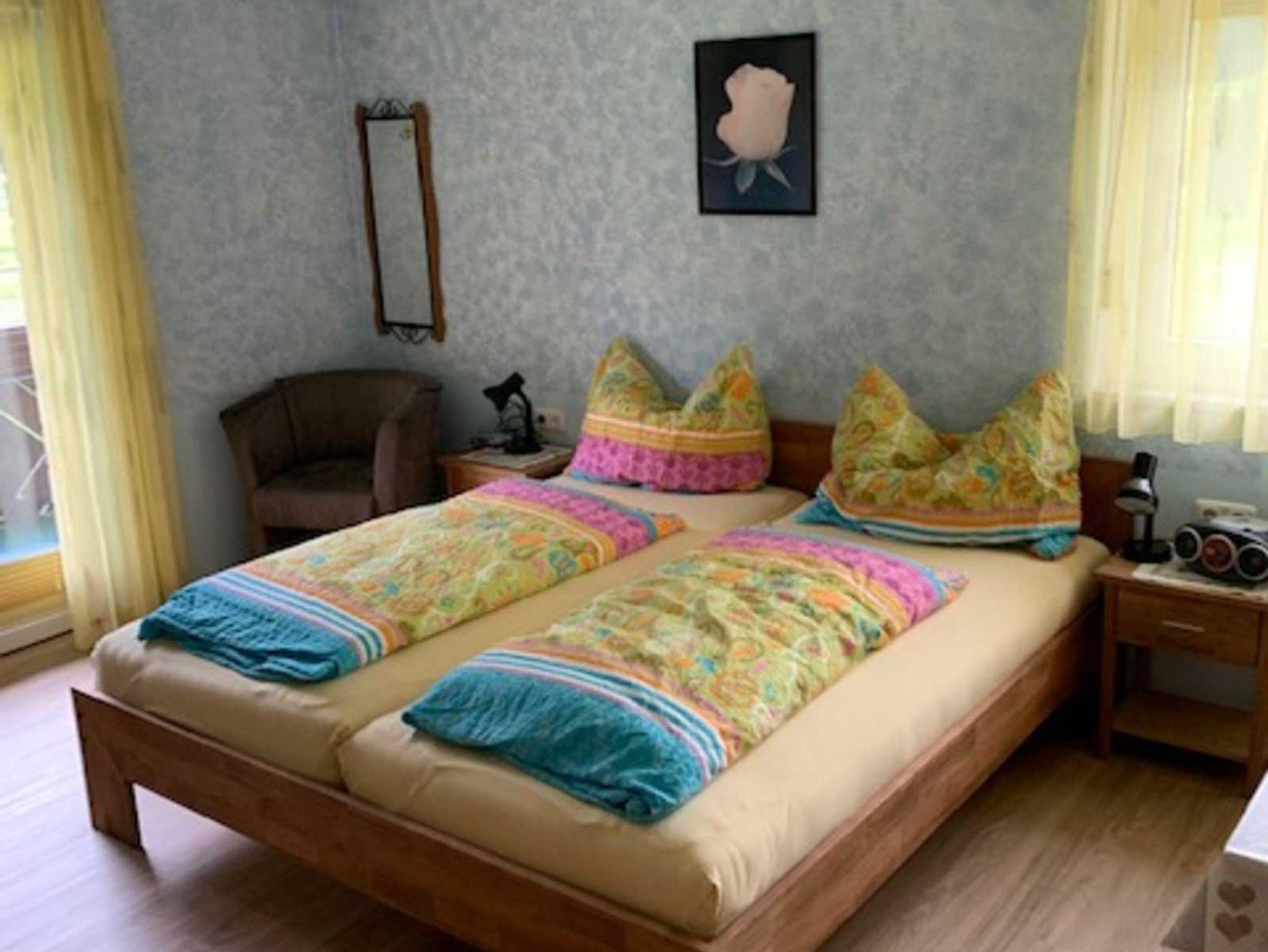 20 m², im.1.Stock,mit Dusche/WC und Balkon ,Doppelbett, Flachbildschirm 32 Kabel/TV, Radiowecker ,Essecke, kleiner Kühlschrank, Filterkaffeemaschine, auf Wunsch eine Cafissimo Pure Kapselmaschine, Sonderausstattung Zimmer: Wasserkocher, Toaster, Eierkocher, Geschirr und Besteck vorhanden, keine Kochmöglichkeit, keine Küche
