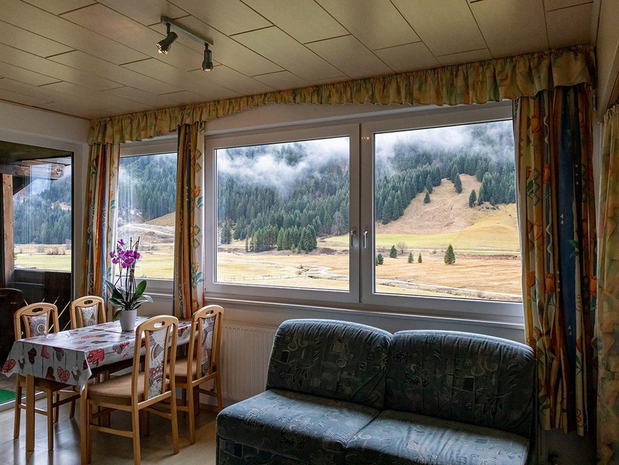 Appartement No.1: 52 m²,Küche im Wohnraum mit Essecke und ausziehbare Doppelbettcouch, Schlafzimmer mit Doppelbett und eine Schlafcouch, Diele, großes Bad(DU/WC) mit Balkontüre. südseitiger Balkon mit Sicht zur Krinnenspitze, Balkon mit drei Zugängen, große Panoramafenster.