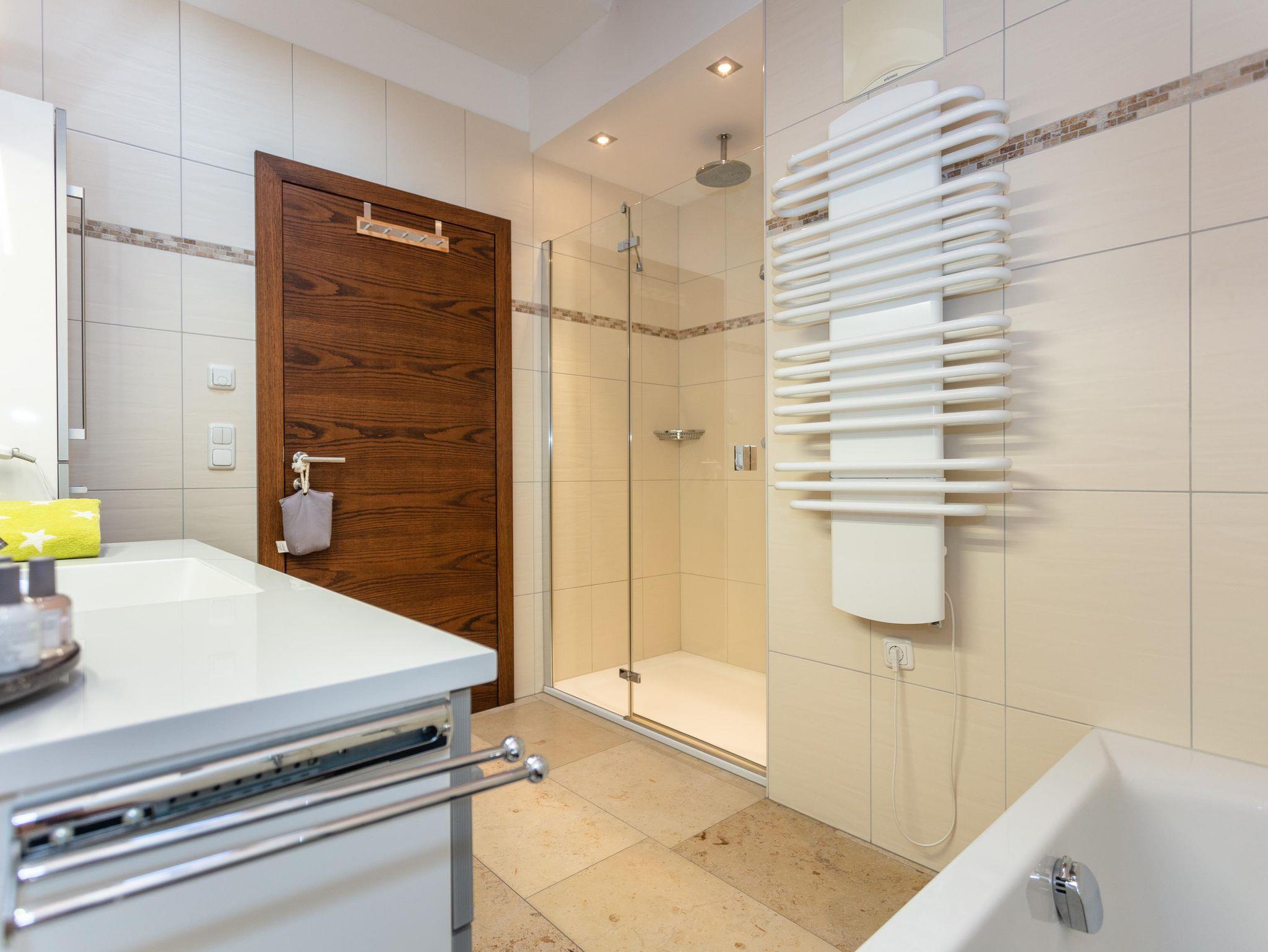 Die ca. 75 m² sind gemütlich eingerichtet und beinhalten eine Wohn- und Essecke, eine Küche, Kabel-TV, WLAN, ein Schlafzimmer mit Doppelbett, ein Schlafzimmer mit Doppelbatt und Schlafcouch und ein großzügiges Badezimmer mit Dusche, Badewanne. In der Wohnung befindet sich ein separates WC.
