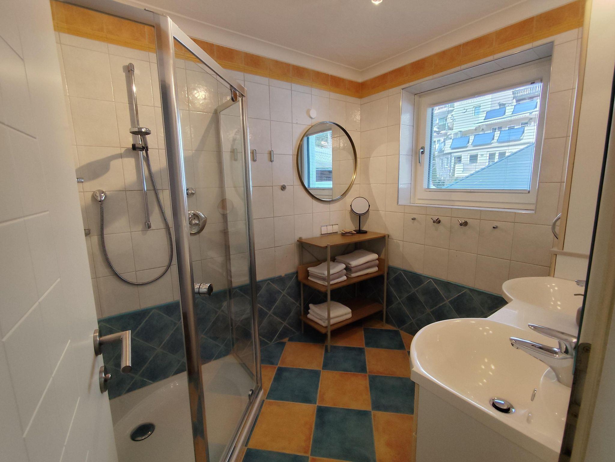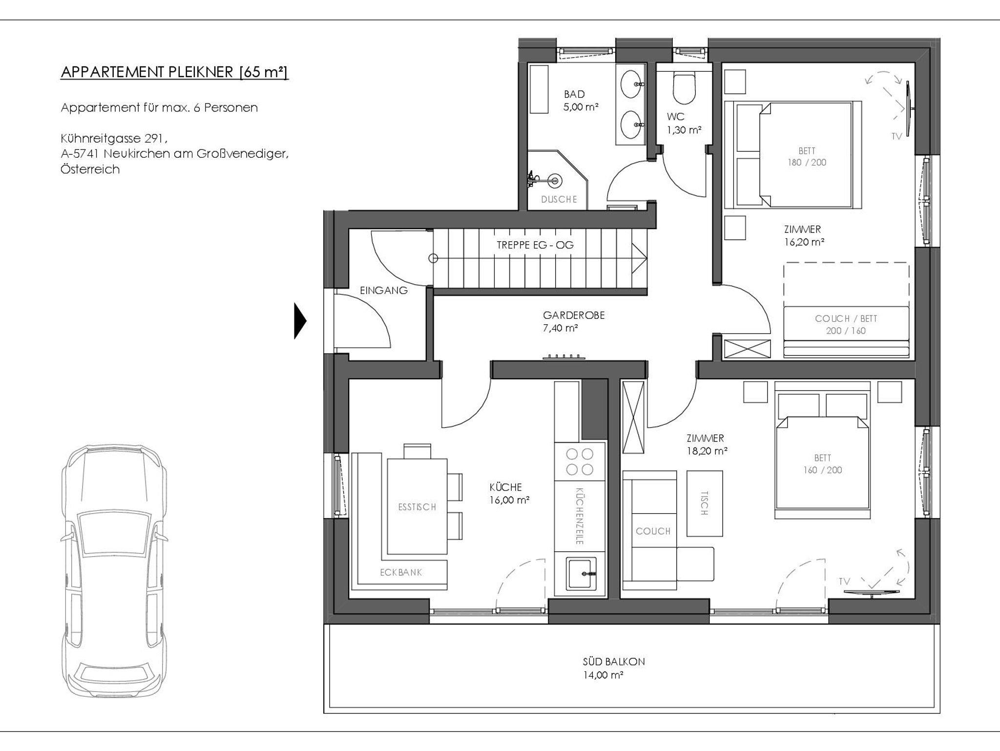 In dieser Wohnung befindet sich 1 Schlafzimmer mit Doppelbett (1,80x2,00m) und mit einer ausziehbaren Couch (1,60x2,00m) und TV, 1 Schlafzimmer mit Doppelbett (1,60x2,00m) und gemütlicher Couch und TV, 1 Badezimmer mit Doppelwaschbecken und Eckdusche, 1 separates WC, 1 vollausgestattete Küche, kleiner Vorraum mit Garderobe. Skiraum. ca. 65m²
