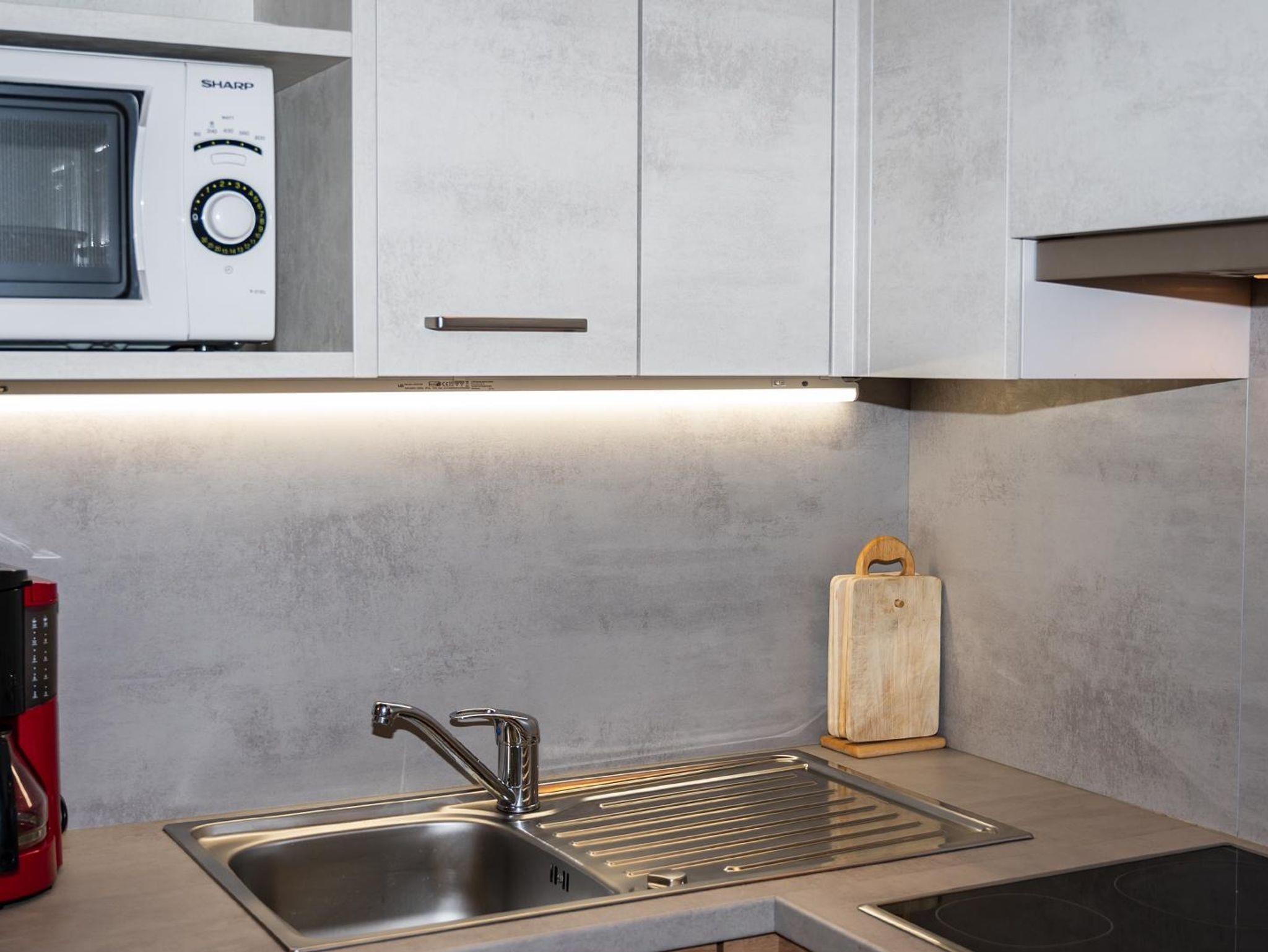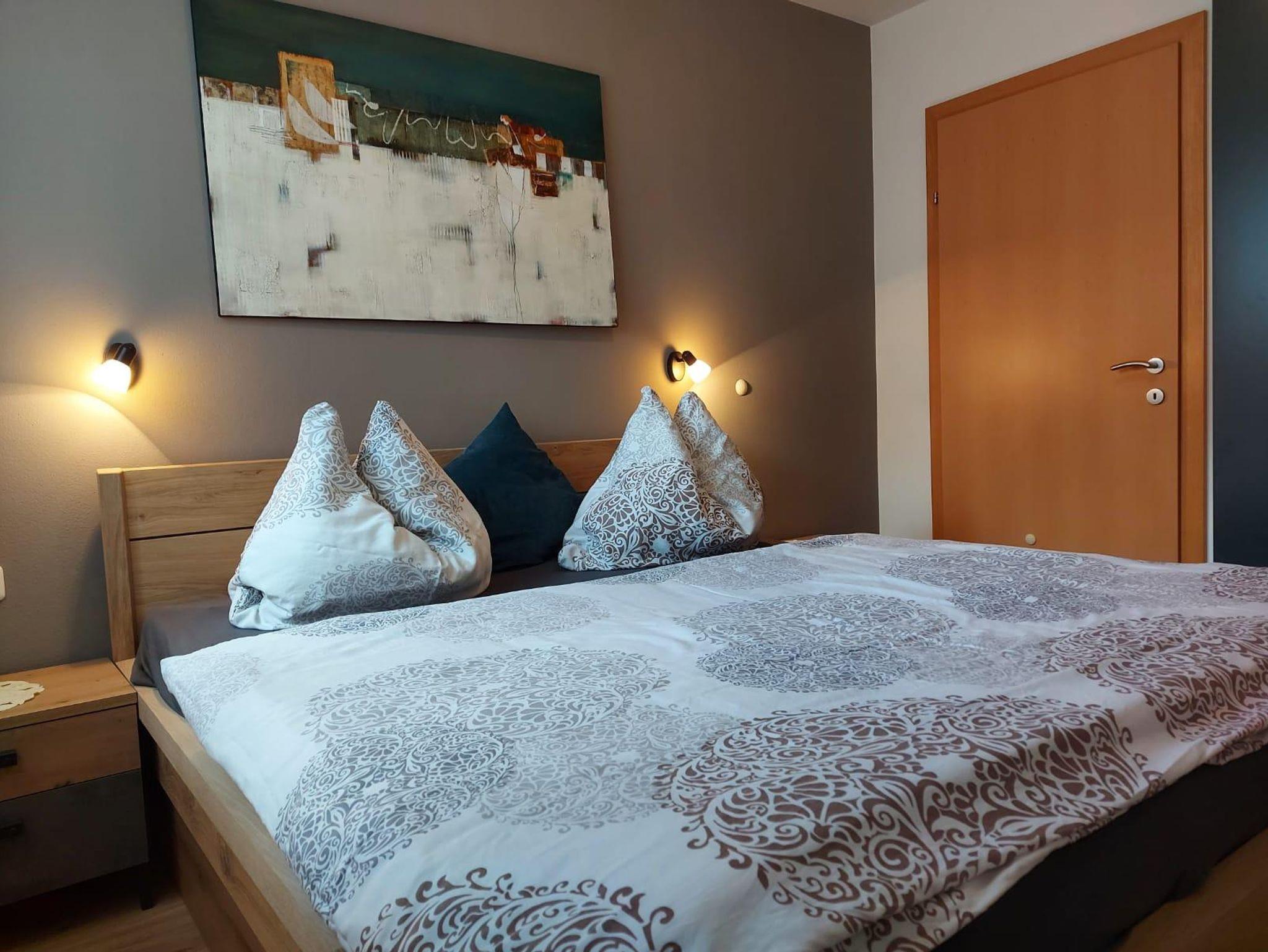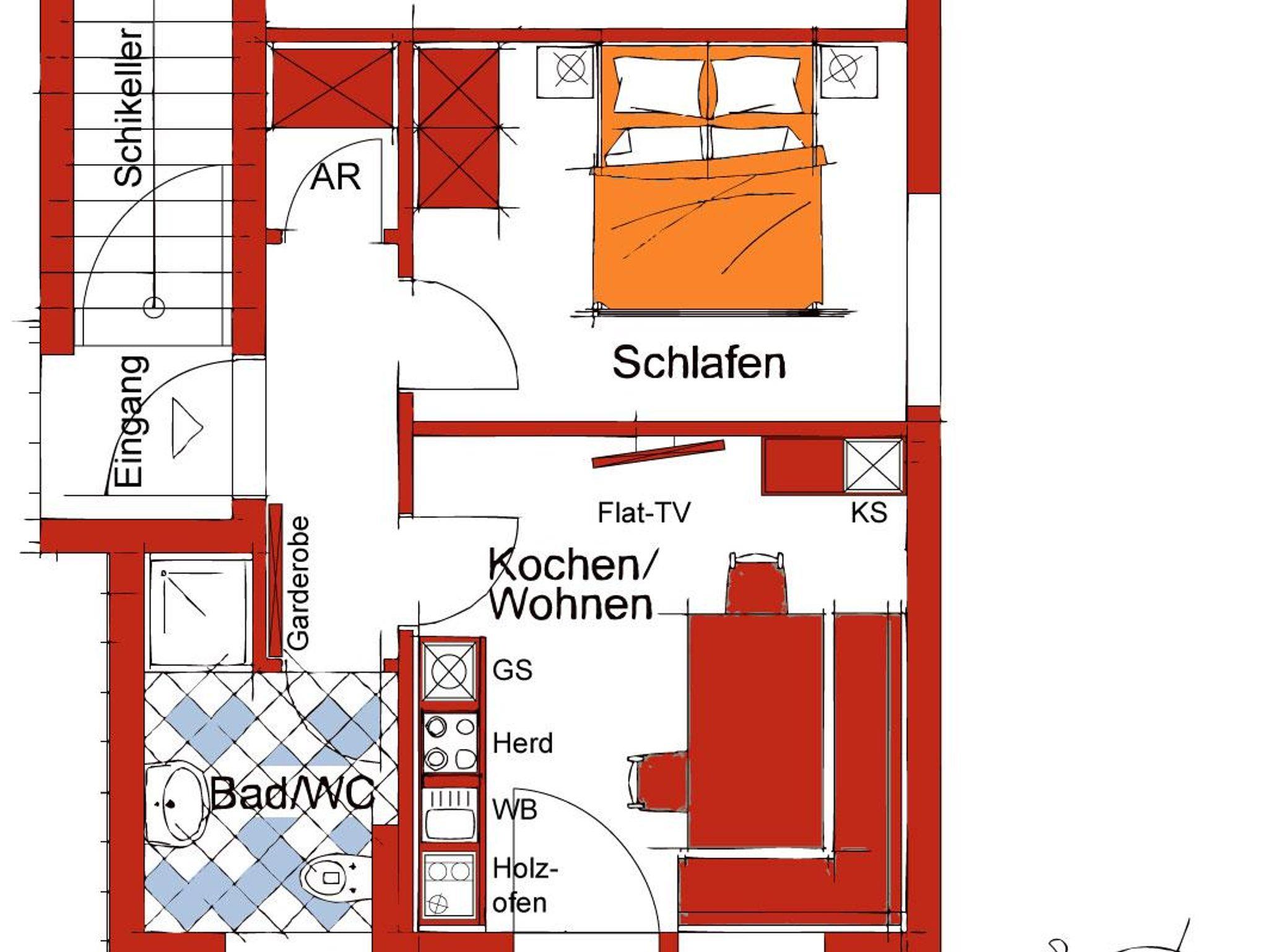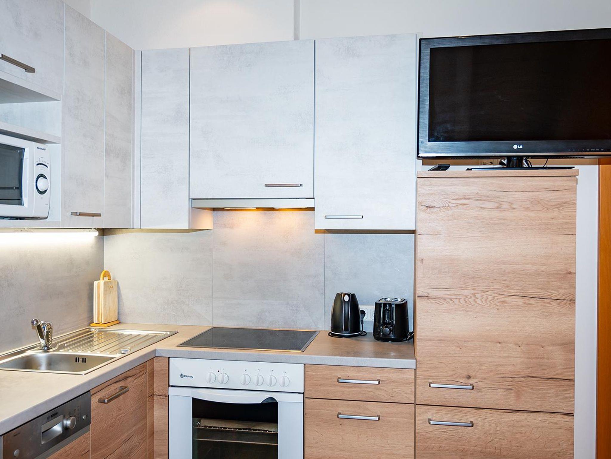 Ausstattung der Wohnung: eine Wohnküche (E-Herd mit Backofen, Mikrowelle, Geschirrspüler, Kühlschrank inkl. Gefrierfach, Safe) mit Esstisch und Wohnbett für 2 Personen, ein Doppelschlafzimmer, Schrankraum, Badezimmer/WC,Kosmetikspiegel, Flat-TV, Internetzugang