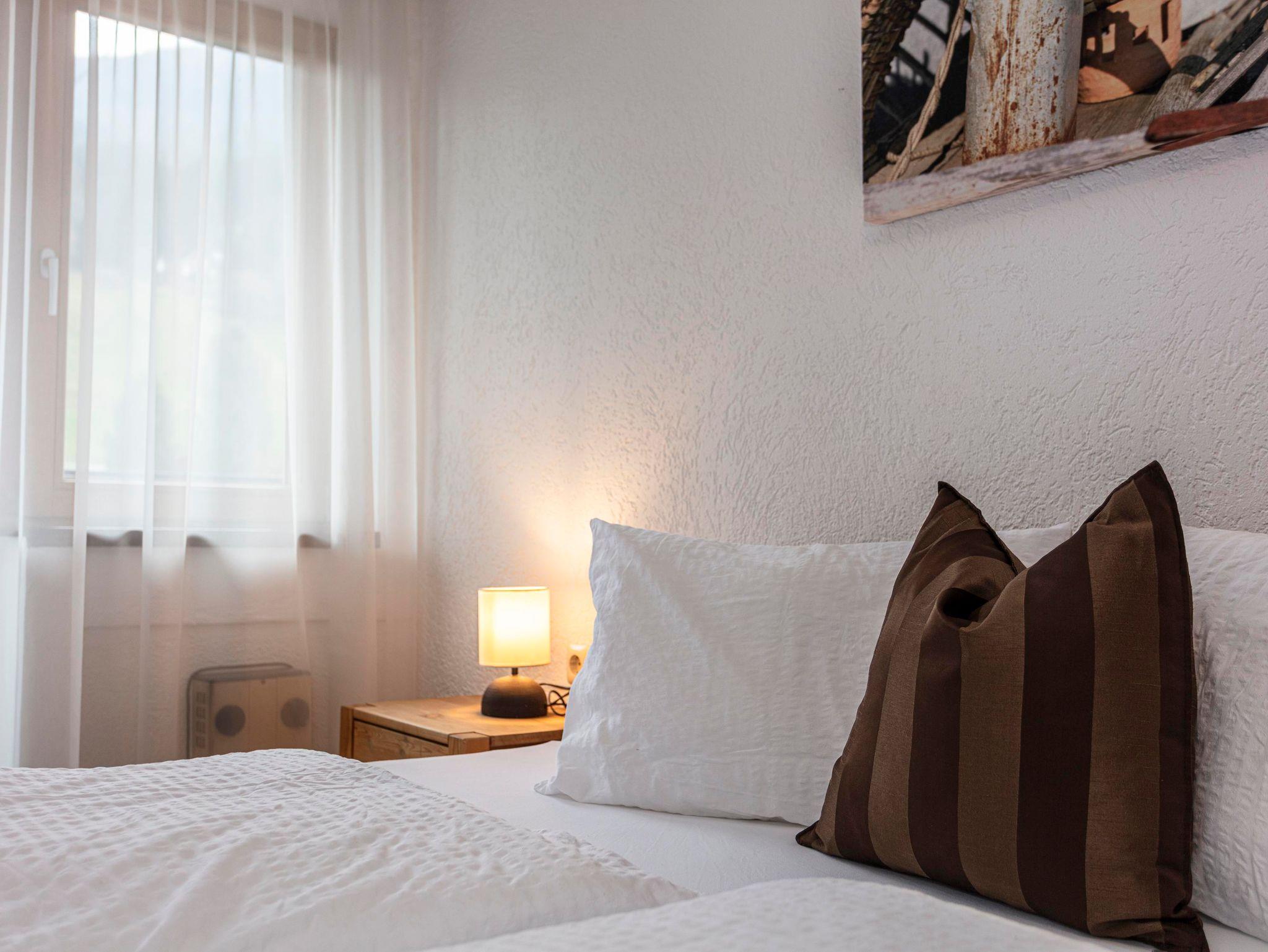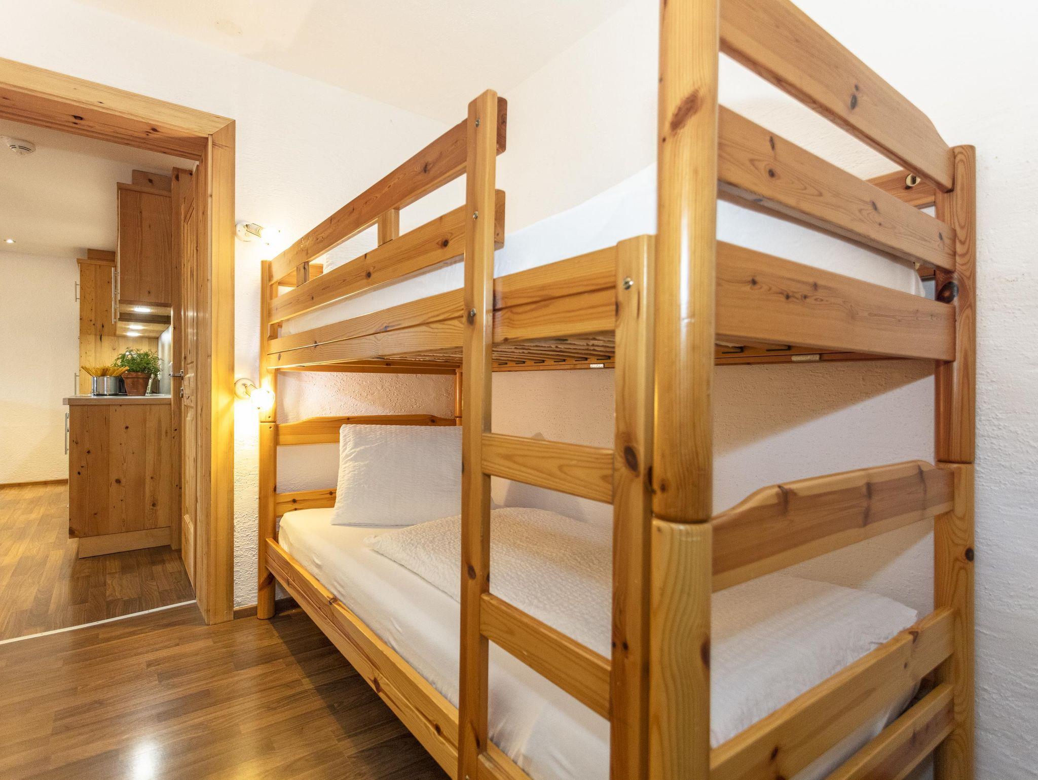 Schlafzimmer mit Doppelbett, Schlafkoje mit Etagenbett, Wohnraum mit Küche (ausziehbare Doppelcouch), modernes Bad mit Dusche und WC, großzügige Sonnenterrasse mit traumhaftem Bergblick