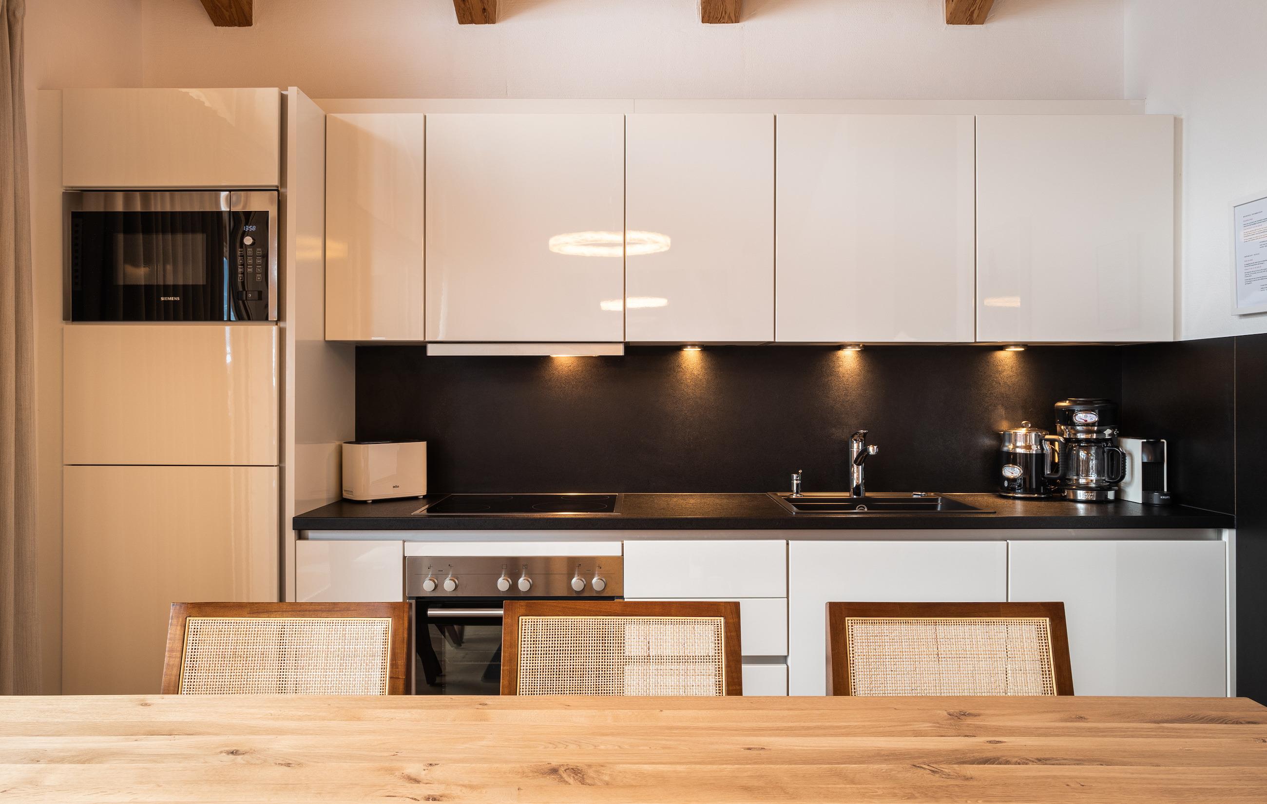 - Offene Küche: Voll ausgestattet mit Wasserkocher, Toaster, 4-Platten-Keramikherd, Kaffeemaschine (Tassen & Filter), Backofen, Mikrowelle, Geschirrspüler, Kühlschrank mit Gefrierfach
