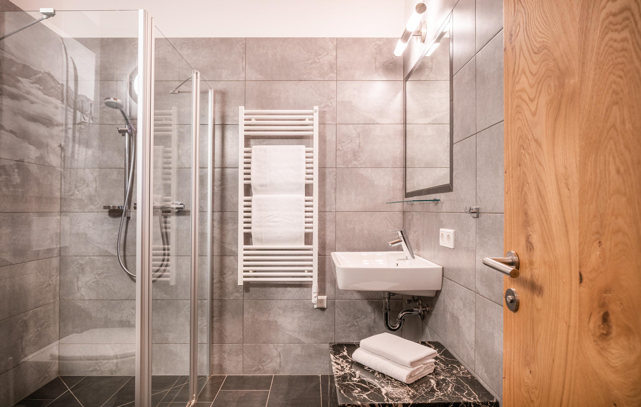 - Badezimmer: Dusche, Waschbecken, WC