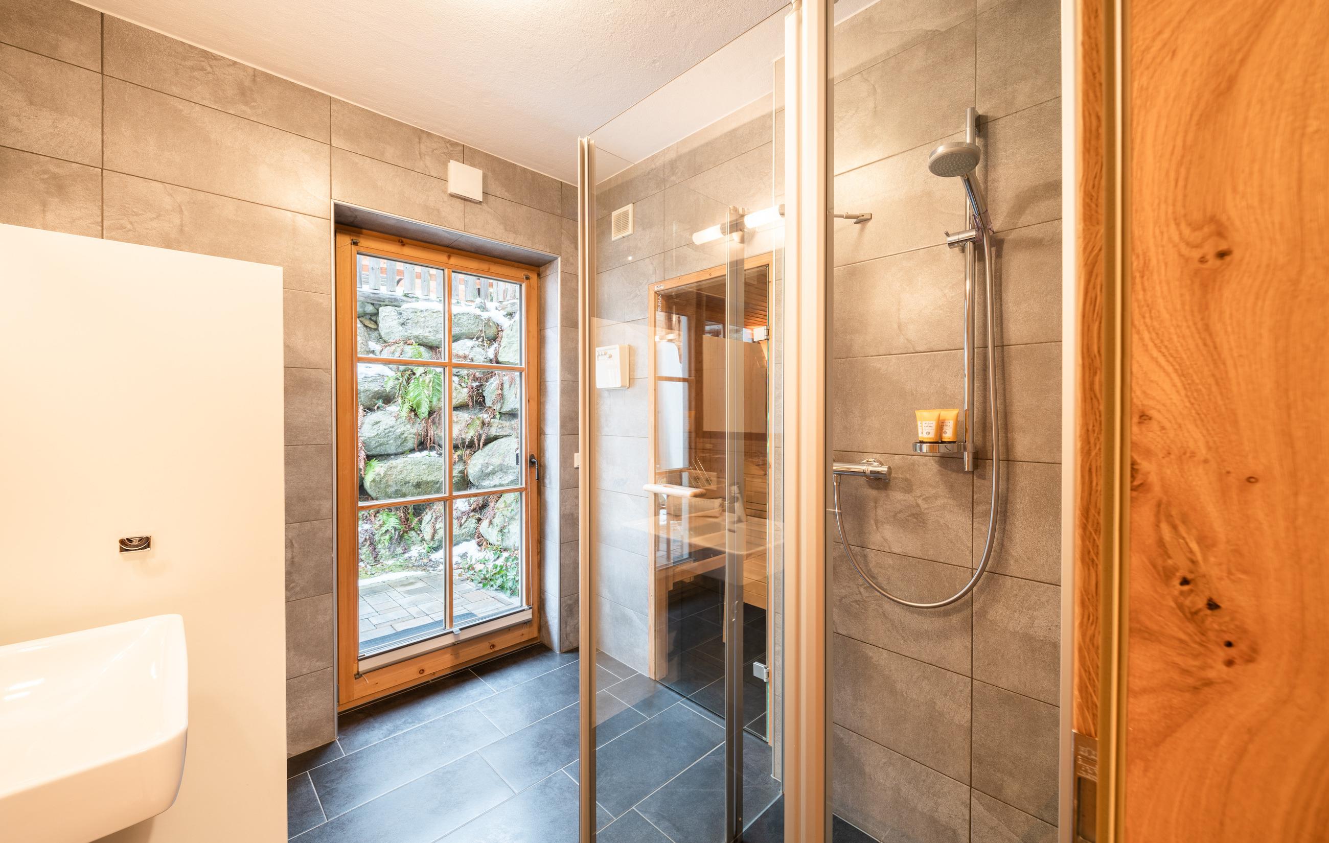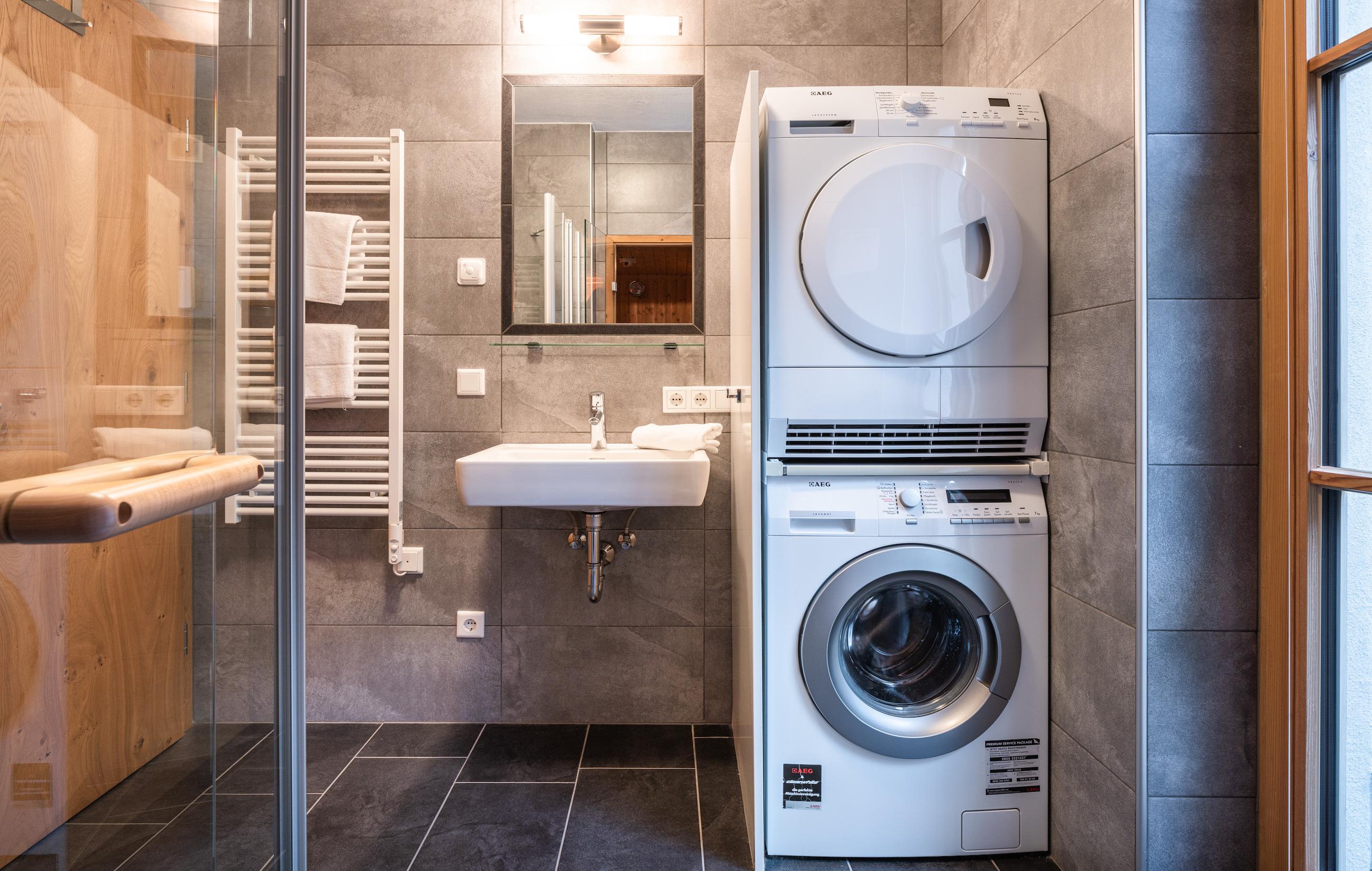 - Badezimmer: Dusche, Sauna, Waschbecken, Waschmaschine, Wäschetrockner