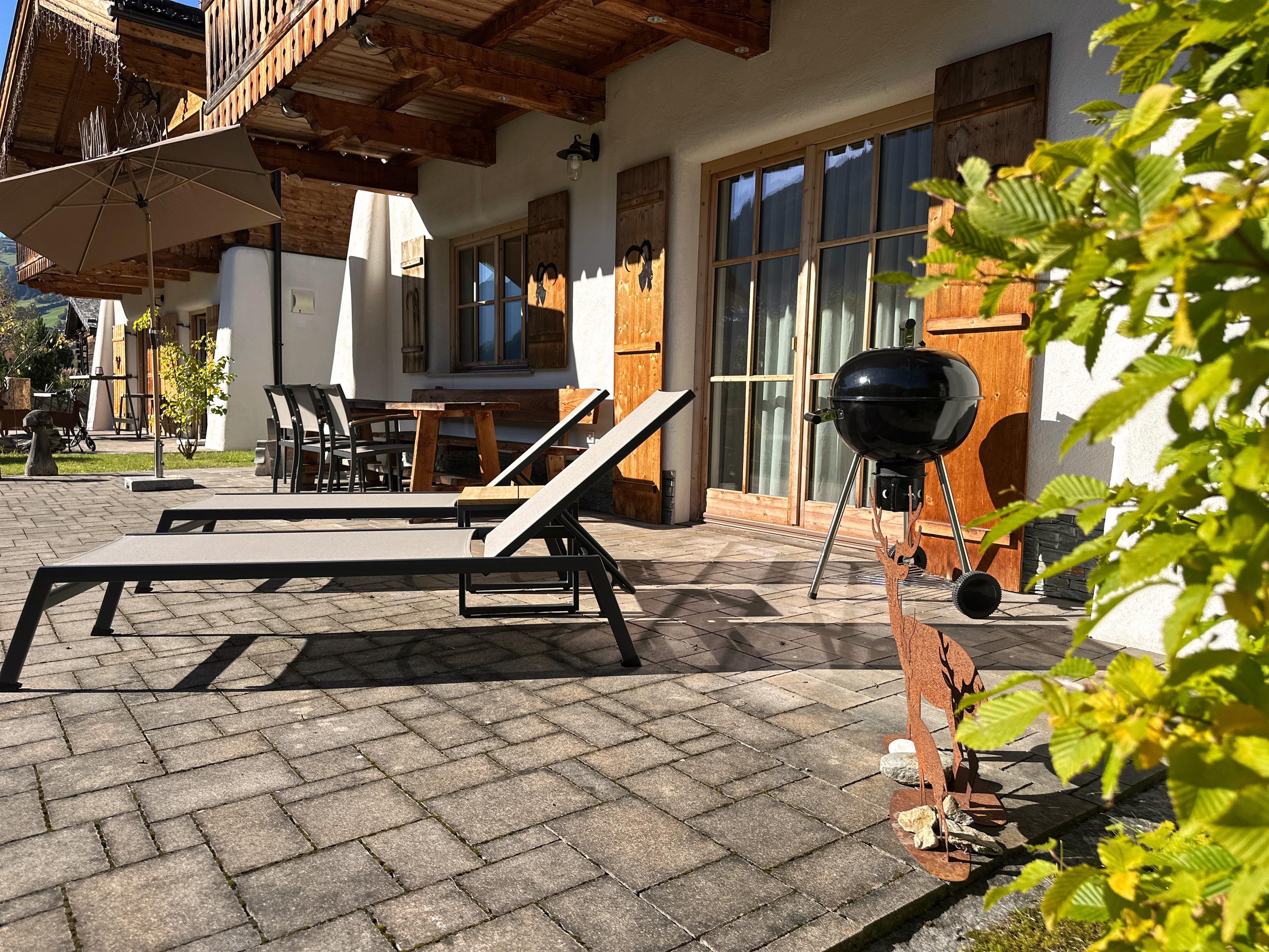 - Garten mit Esstisch, Loungeecke, Sonnenliegen, Sonnenschirm & Grill
