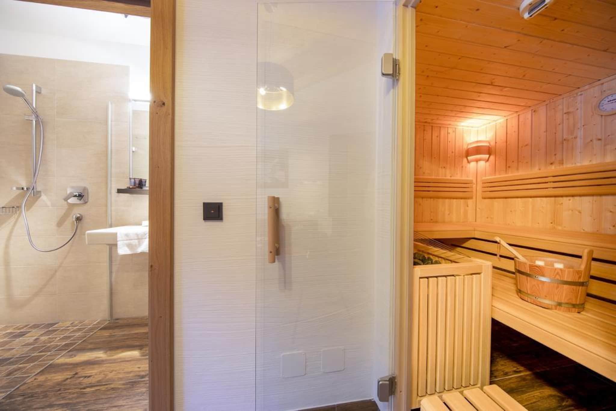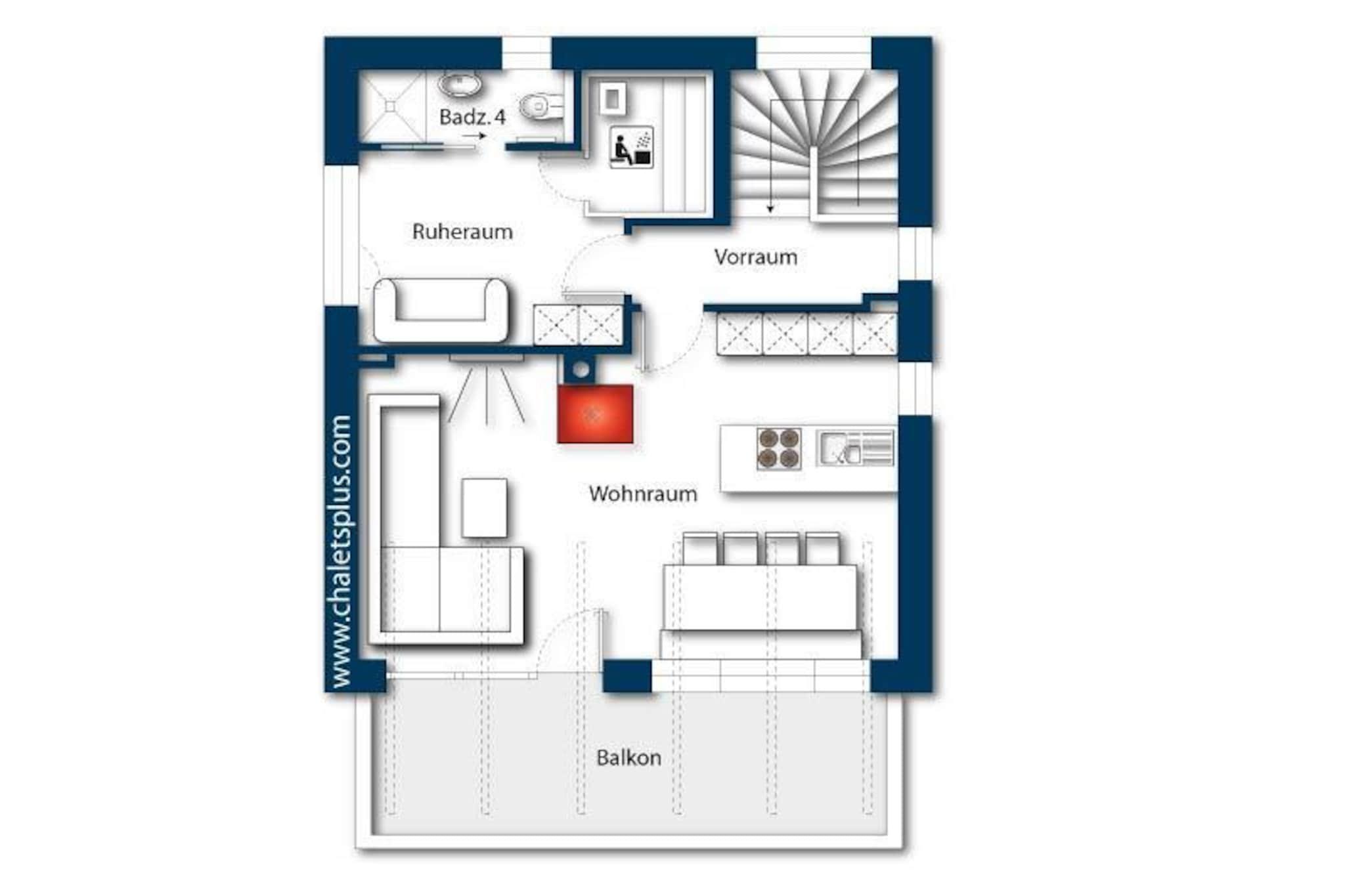 Ground floor: (hallway, storage(washing machine), ski storage(ski boot heaters), Internet access) On the 1st floor: (Bedroom with bathroom(double bed, shower, washbasin, toilet), Bedroom with bathroom(double bed, shower, washbasin, toilet), Bedroom with bathroom(double bed, shower, washbasin, toilet), Landing, terrace) On the 2nd floor: (Living room(TV, fireplace), open kitchen(electric kettle, coffee machine(filter), oven, dishwasher, fridge-freezer), bathroom(shower, washbasin, toilet), Landing, relaxation area(seating area, sauna), balcony) carport, Internet access, garden furniture, parking, parking, swimming pool(shared with other guests, natural swimming pond)