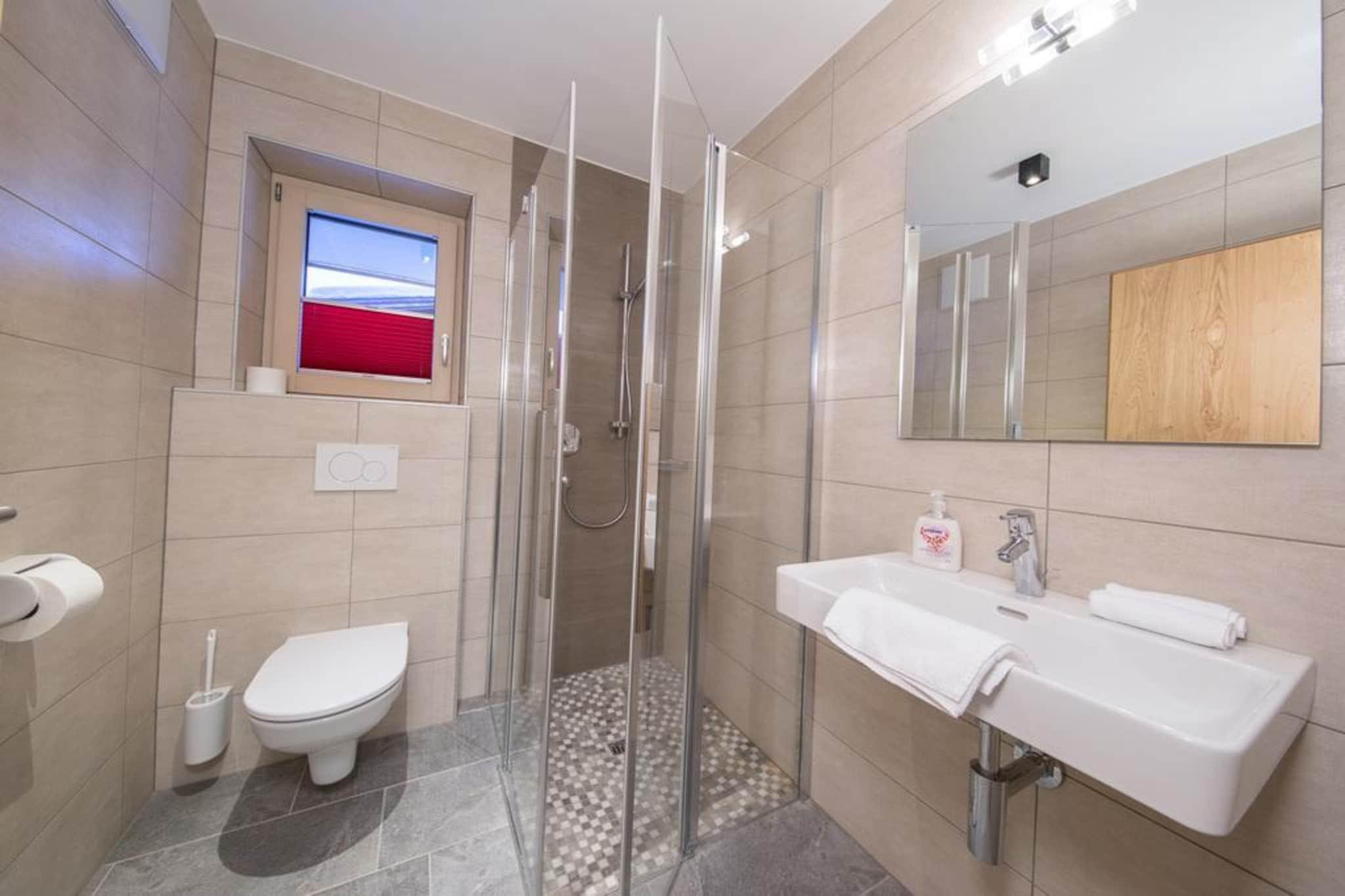 Ground floor: (hallway, Bedroom with bathroom(double bed, shower, washbasin, toilet), Internet access) On the 1st floor: (bedroom(double bed), bedroom(double bed), bedroom(double bed), bathroom(shower, washbasin, toilet), bathroom(shower, washbasin, toilet), bathroom(shower, washbasin, toilet)) Living room(TV(cable, satellite, digital)), Kitchen(oven, combination microwave, microwave, dishwasher, fridge-freezer), relaxation area(shower, sauna, toilet, deckchairs), ski storage, carport, Internet access, stove(tiled), balcony or terrace, parking, parking, swimming pool(shared with other guests, natural swimming pond)