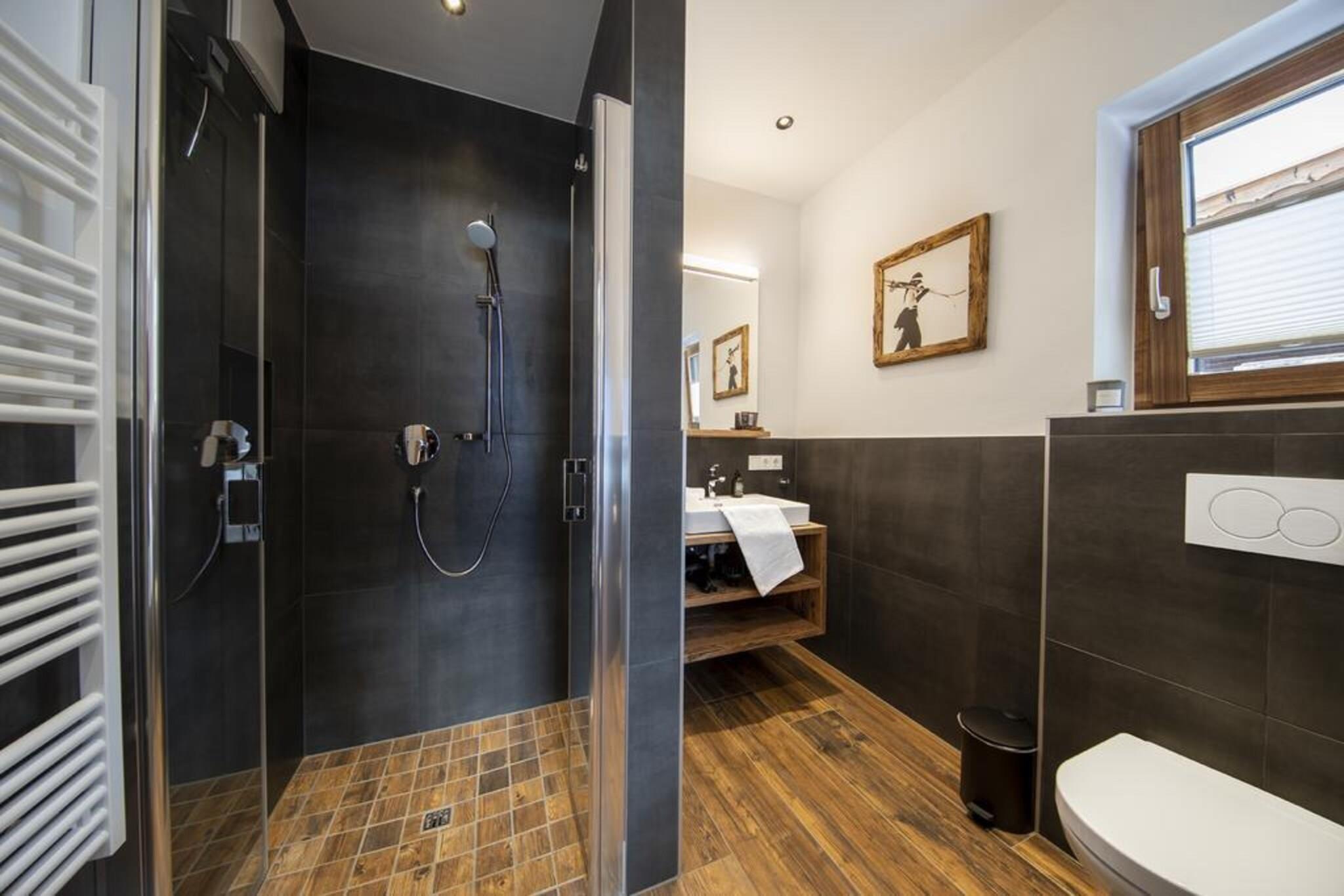 Ground floor: (Living room(TV(satellite), stove(wood)), open kitchen(electric kettle, boiling water tap, coffee machine, oven, microwave, dishwasher), ski storage(ski boot heaters), Internet access, balcony, terrace) Basement: (bedroom(double bed), bedroom(double bed), bedroom(double bed), Bedroom with bathroom(double bed, shower, washbasin, toilet), bathroom(shower, washbasin, toilet), bathroom(shower, toilet), bathroom(shower, toilet), bathroom(toilet, toilet), Landing(shower), relaxation area(seating area, sauna), storage(tumble dryer, washing machine), terrace) carport, Internet access, garden furniture, parking, parking, swimming pool(shared with other guests, natural swimming pond)