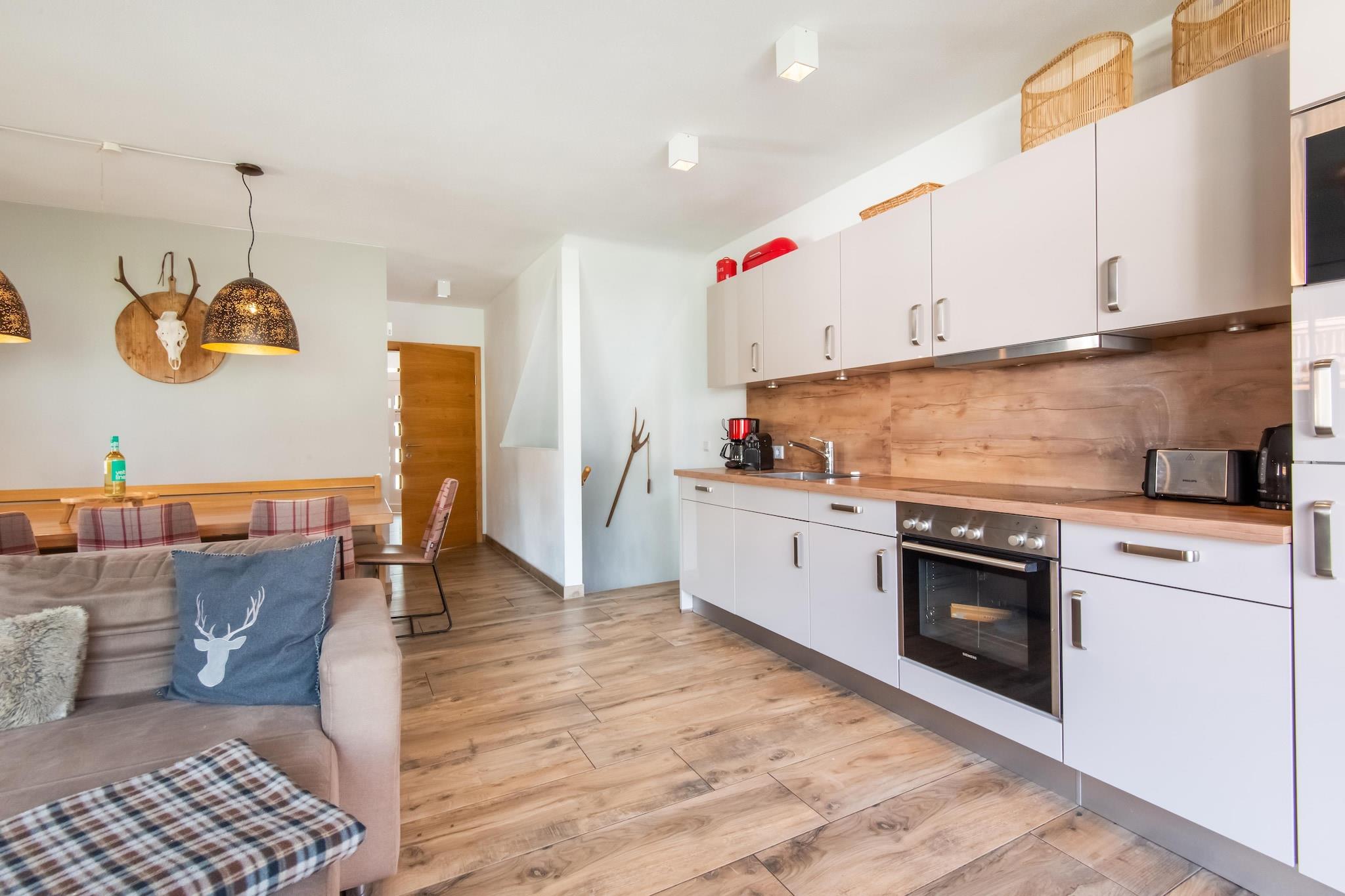 This modern detached holiday home for a maximum of 10 people is located in Niedernsill in Salzburgerland, in the middle of the ski areas of Zell am See, Kaprun and Saalbach-Hinterglemm. The holiday home offers a large living room with seating area, a modern open and fully equipped kitchen, 4 spacious bedrooms, 2 with bathrooms en-suite and one with an extra bunk bed, another bathroom and a large terrace with access to the garden. The garden is equipped with garden furniture. There is also a relaxation area with sauna, shower and loungers, a ski storage room with ski boot warmer and a washing machine and dryer. Parking is available directly at the house. Directly in Niedernsill you can find the Nagelköpfl - Piesendorf ski area with 2 kilometers of slopes and 3 lifts/cable cars and Niedernsill with 1 kilometer of slopes and 2 lifts/cable cars. The well-known ski areas in Salzburgerland such as the glacier ski area in Kaprun, the Skicircus Saalbach-Hinterglemm / Leogang / Fieberbrunn and the Schmittenhöhe ski area in Zell am See with a total of 408 kilometers of slopes can be reached in just a few minutes by car. In summer you can of course enjoy everything that the Hohe Tauern National Park has to offer, such as the famous Krimml waterfalls, the Grossglockner High Alpine Road, the Kaprun reservoirs and of course the numerous hiking and mountain biking opportunities. In addition, the bathing lake in Niedersill is a 5-minute walk from the holiday home and you can reach the Seespitz lido on Lake Zell in 15 minutes by car. Restaurants, shops and supermarkets can be found in the immediate vicinity of the holiday home.