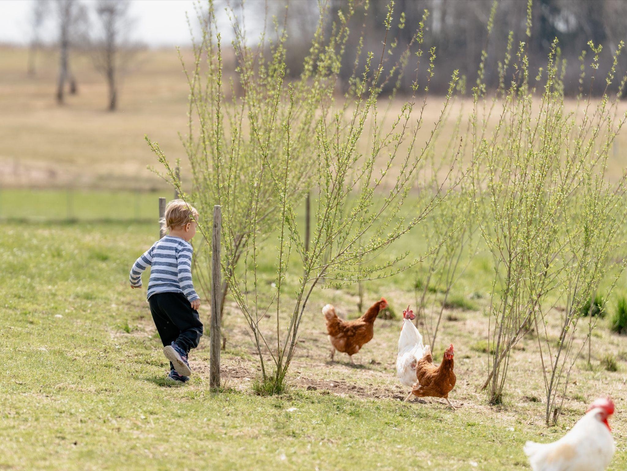 Unser Hof ist die Heimat eines ganz besonderen Stalls: dem Wanderhuhnstall! Hier dürfen unsere Hühner regelmäßig auf neue, saftige Wiesen umziehen, haben viel Platz zum Scharren und Picken und danken es uns mit besonders leckeren Eiern. Ihr könnt die Hühner aus nächster Nähe erleben und vielleicht sogar euer eigenes Frühstücksei direkt aus dem Nest holen!